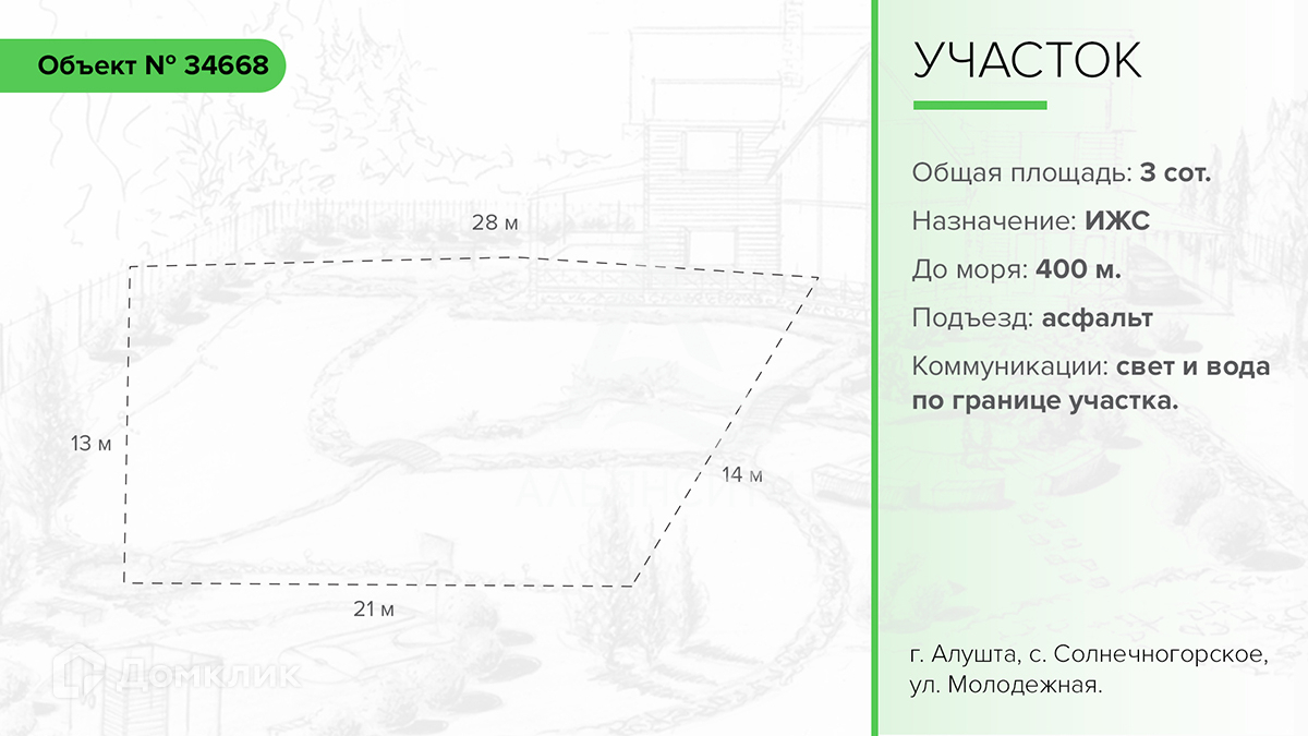 Продается земельный участок в городе Алушта, село Солнечногорское, улица Молодежная, находятся в одном из живописных мест Крыма. Общая площадь участка 3 сотки. Вид разрешенного использования – индивидуальное жилищное строительство.