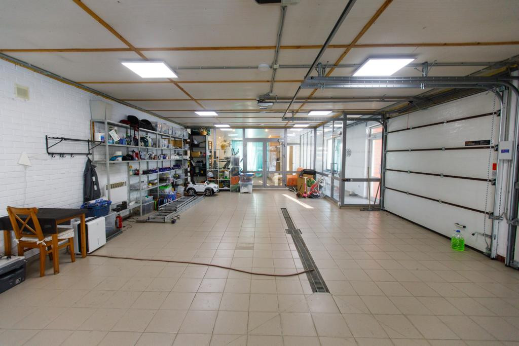 Очень большой и теплый, отапливаемый, на два автомобиля и доптехнику, предусмотрена возможность даже мыть автомобиль со стоком воды в канализацию. Есть горячая и холодная вода. Рядом огромный спортзал 36 кв.м. с климатизацией, панорамными окнами и отдельным санузлом с душевой.