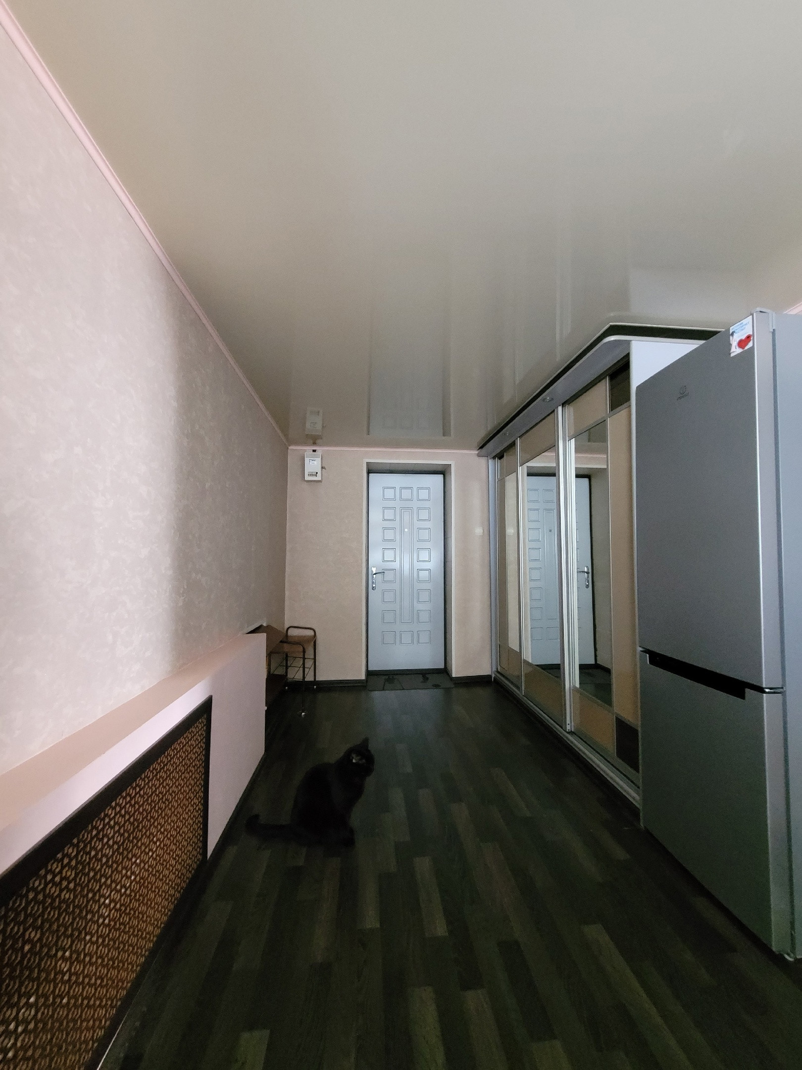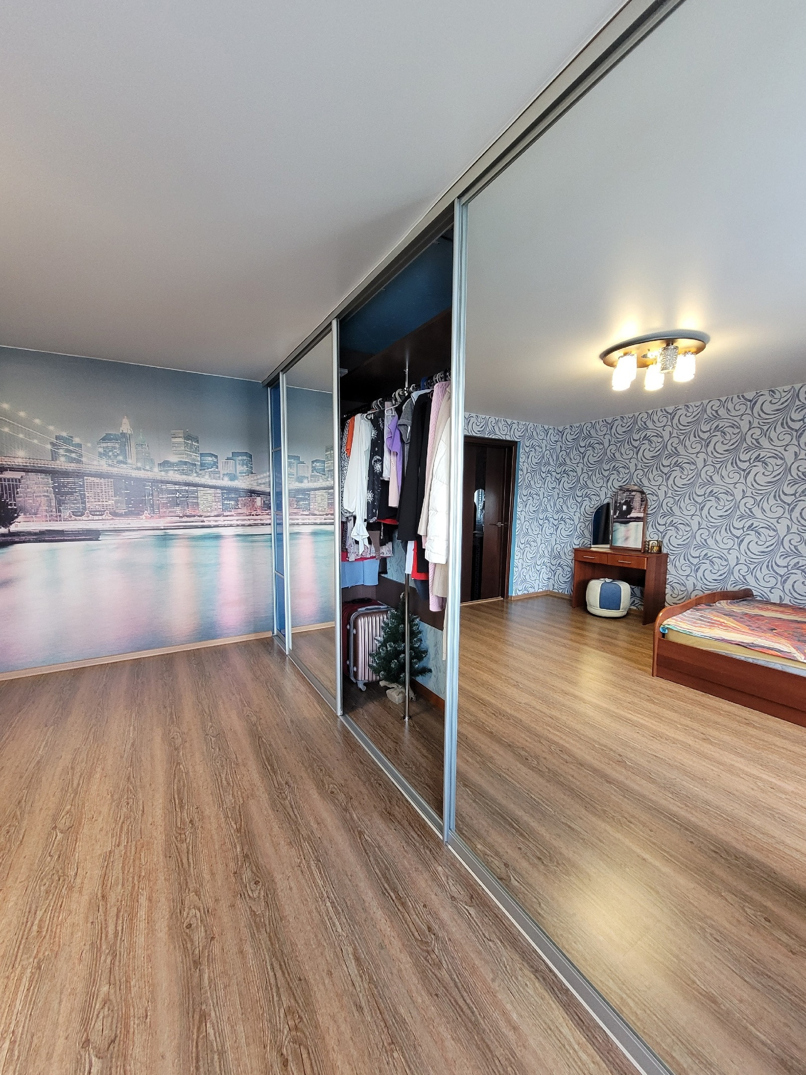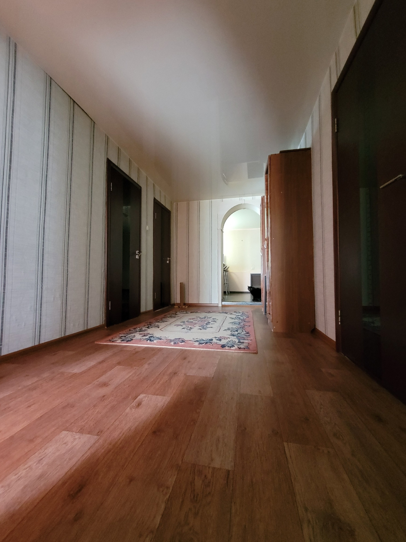 Новым жильцам остается: встроенная гардеробная в спальной комнате (длина 4,5 местра), гардеробная во входной группе, кухонный гарнитур.