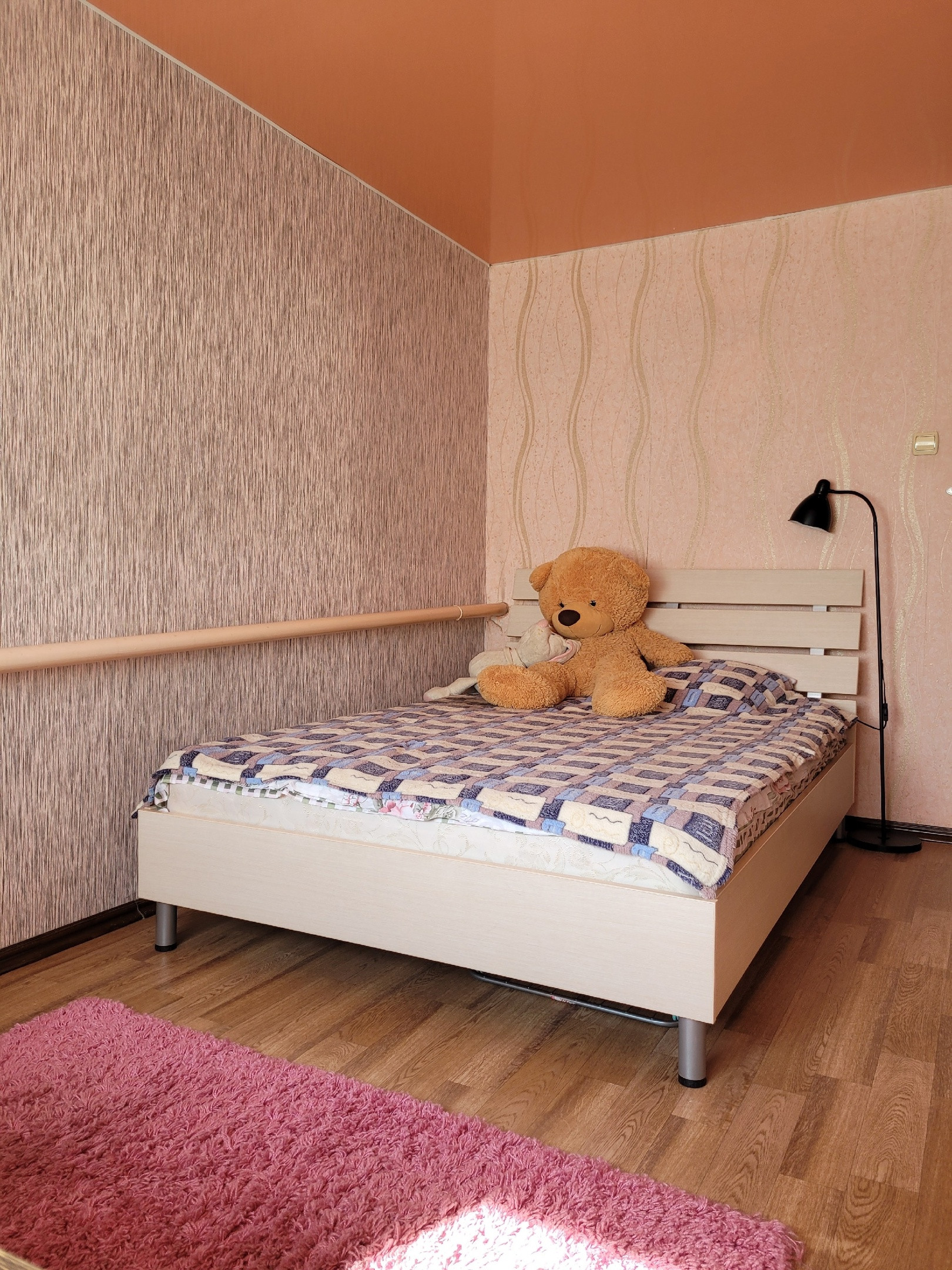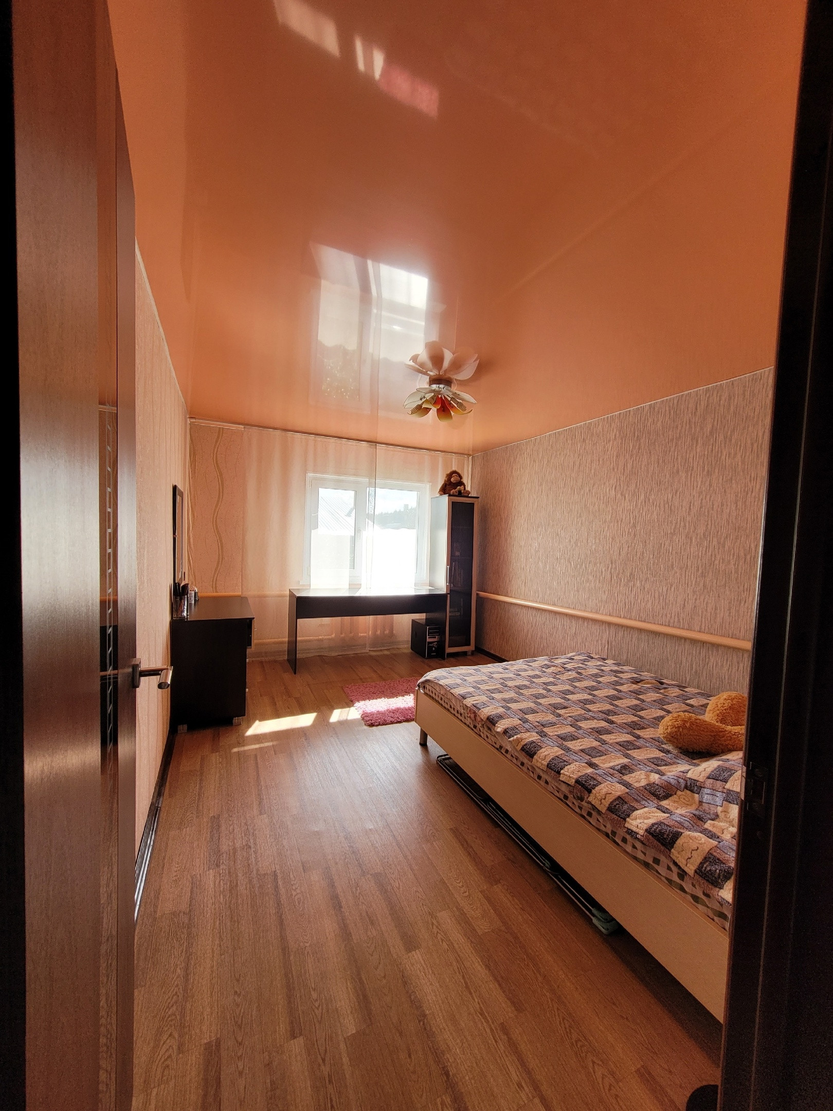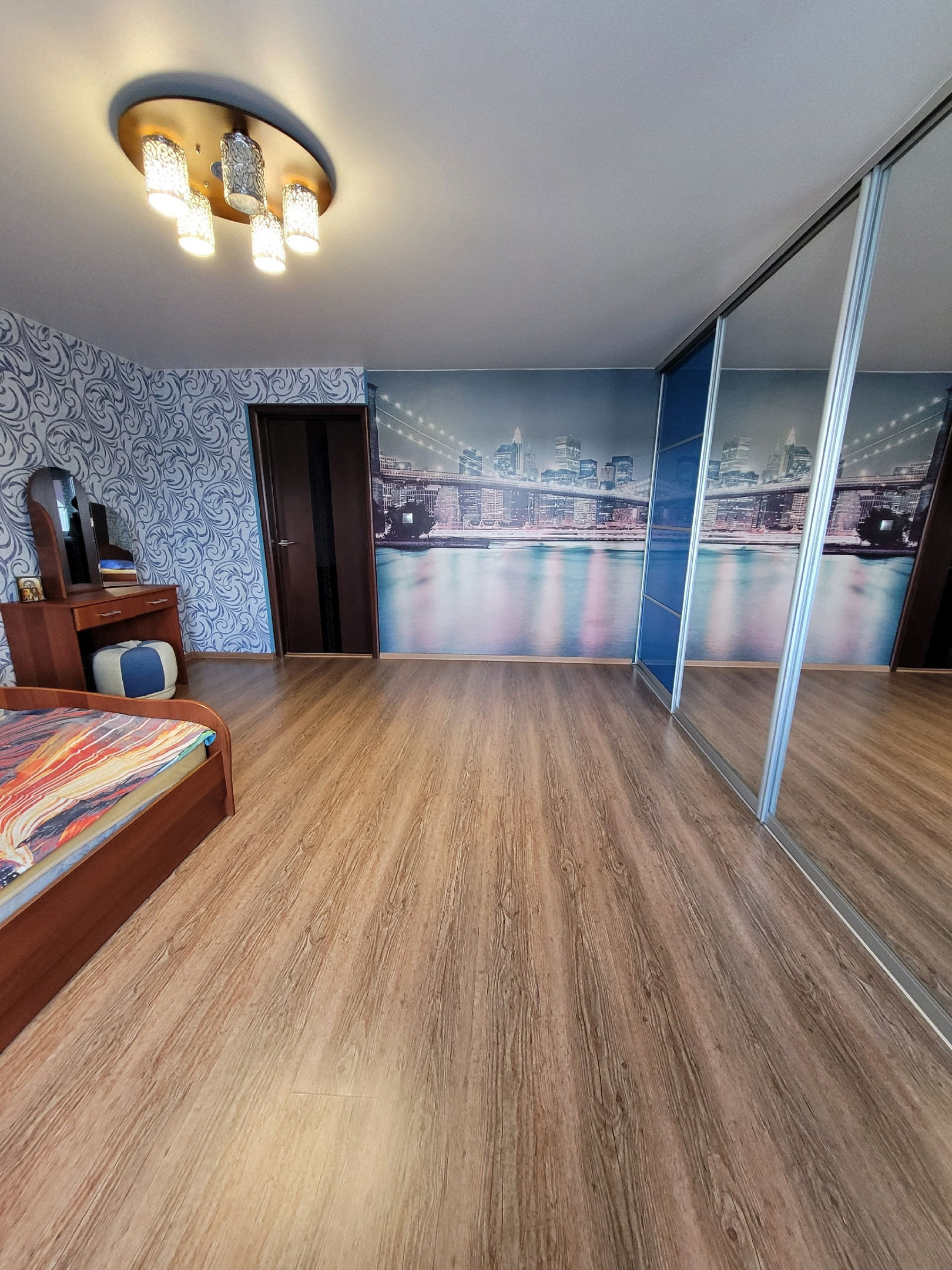 Новым жильцам остается: встроенная гардеробная в спальной комнате (длина 4,5 местра), гардеробная во входной группе, кухонный гарнитур.