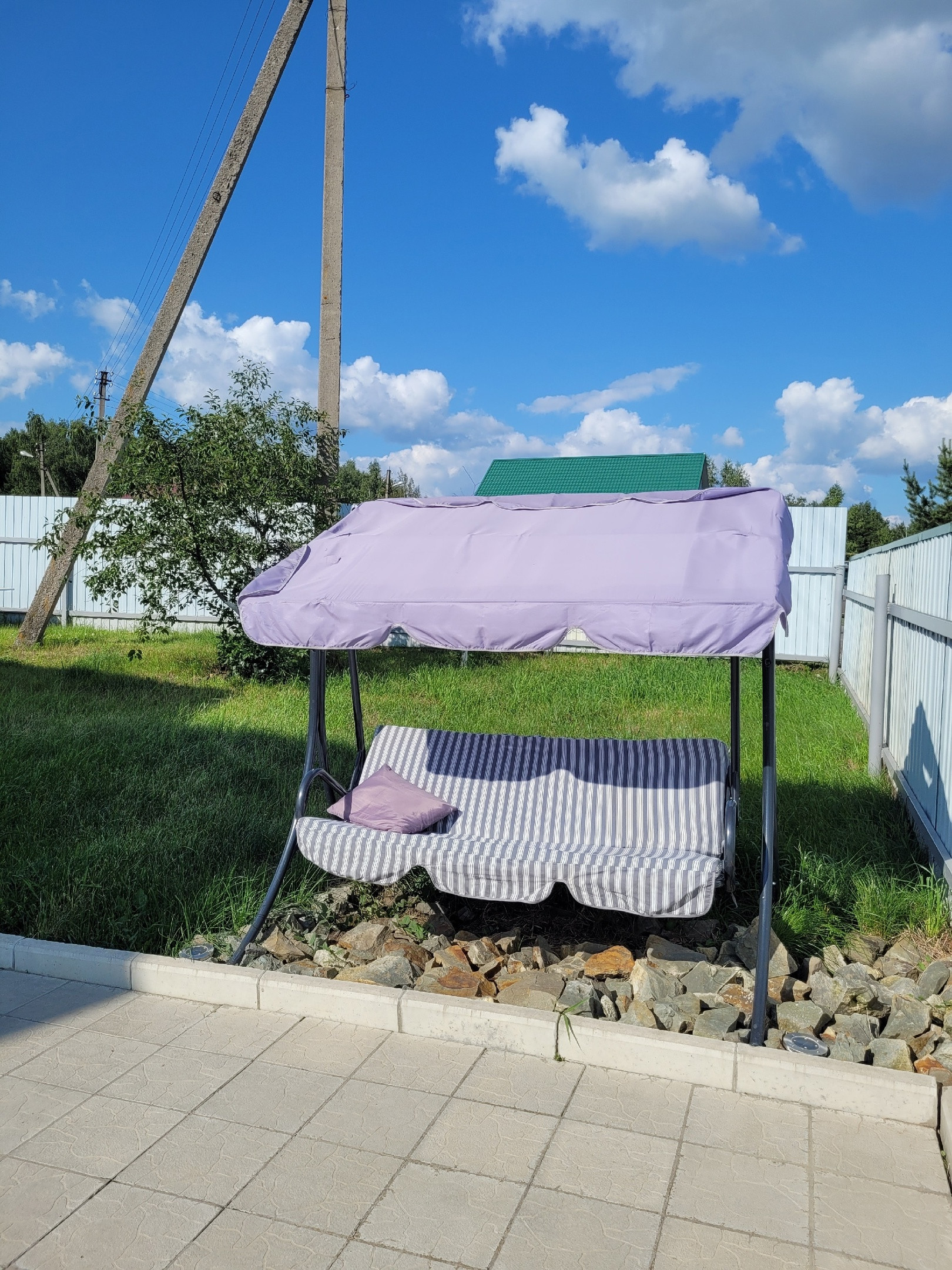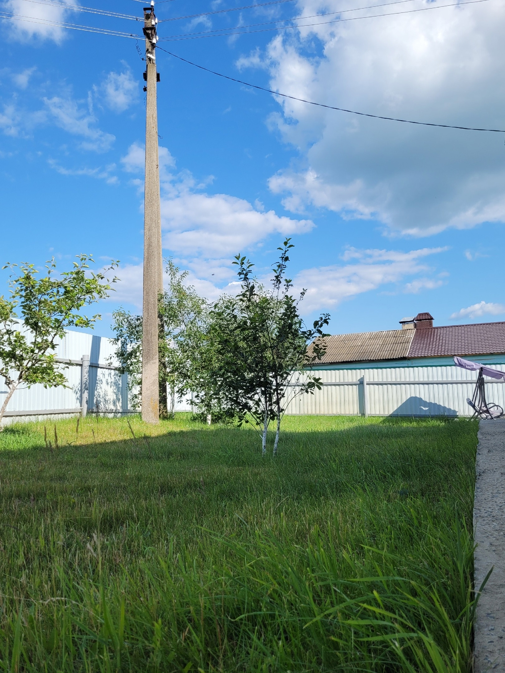 Участок огорожен новым высоким забором, позволяет вместить сад, огород и зону отдыха, а также дополнительные постройки (напр., баню).