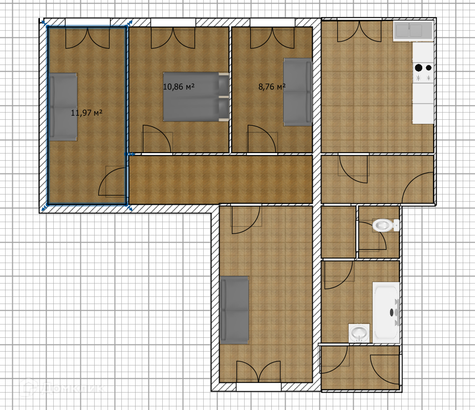 Четыре отдельные комнаты с современным ремонтом (16 кв м, 15 кв м, 12 кв м, 9.5 кв м). Высокие потолки 3 м 15 см дают комнатам много воздуха и простора.