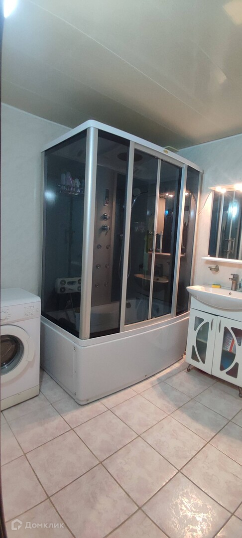Раздельный сан. узел в панелях светлых оттенков. Установлена большая душевая кабина.