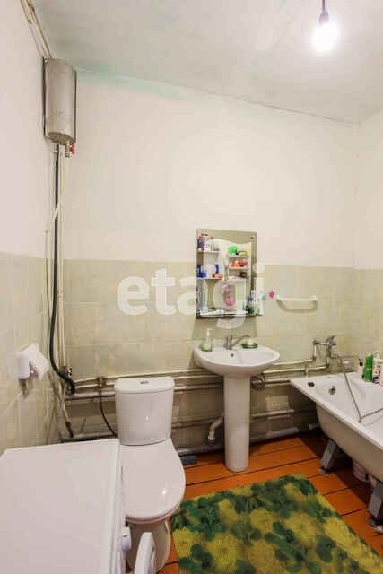 Сан.узел совмещенный , установлены - ванна, унитаз, раковина, подключена стиральная машина, стены отделаны кафельной плиткой.Дом отапливается  твердотопливным котлом, имеется электро.обогрев.
