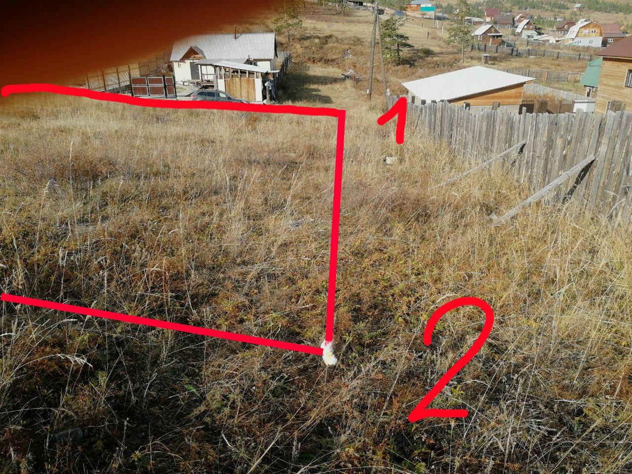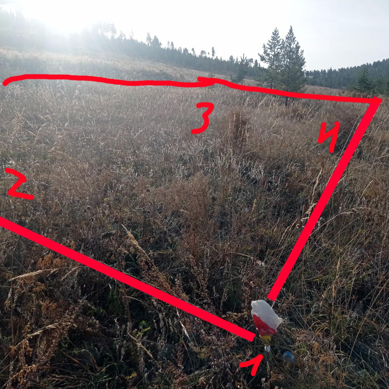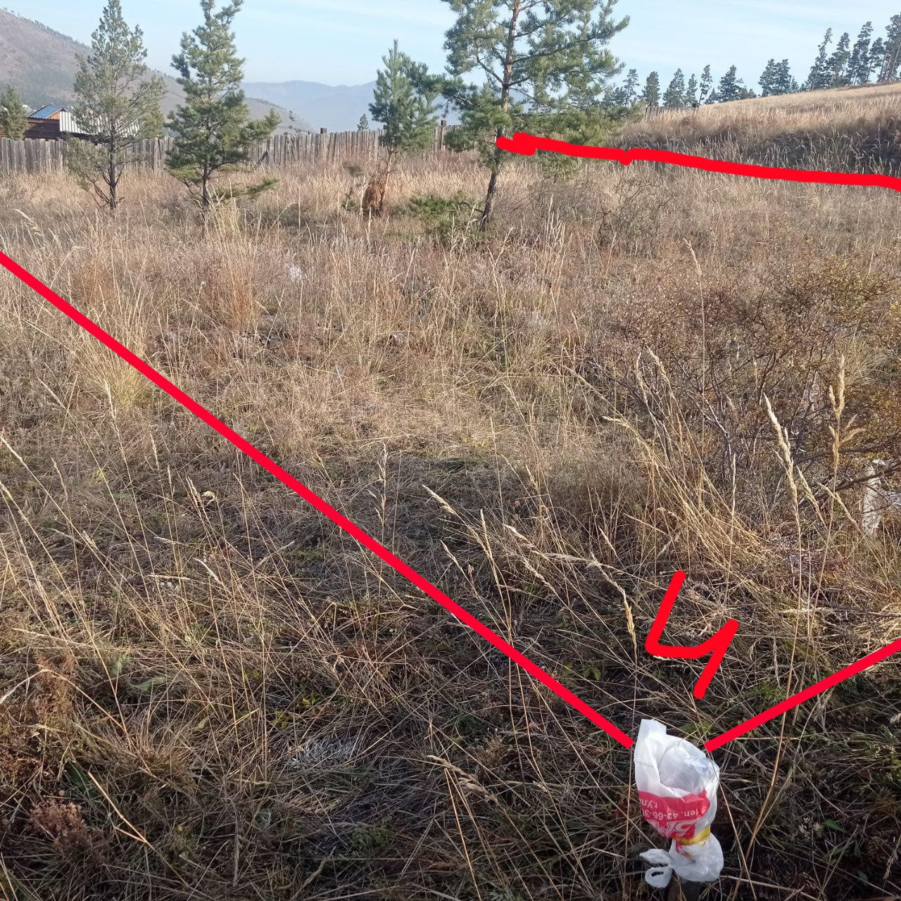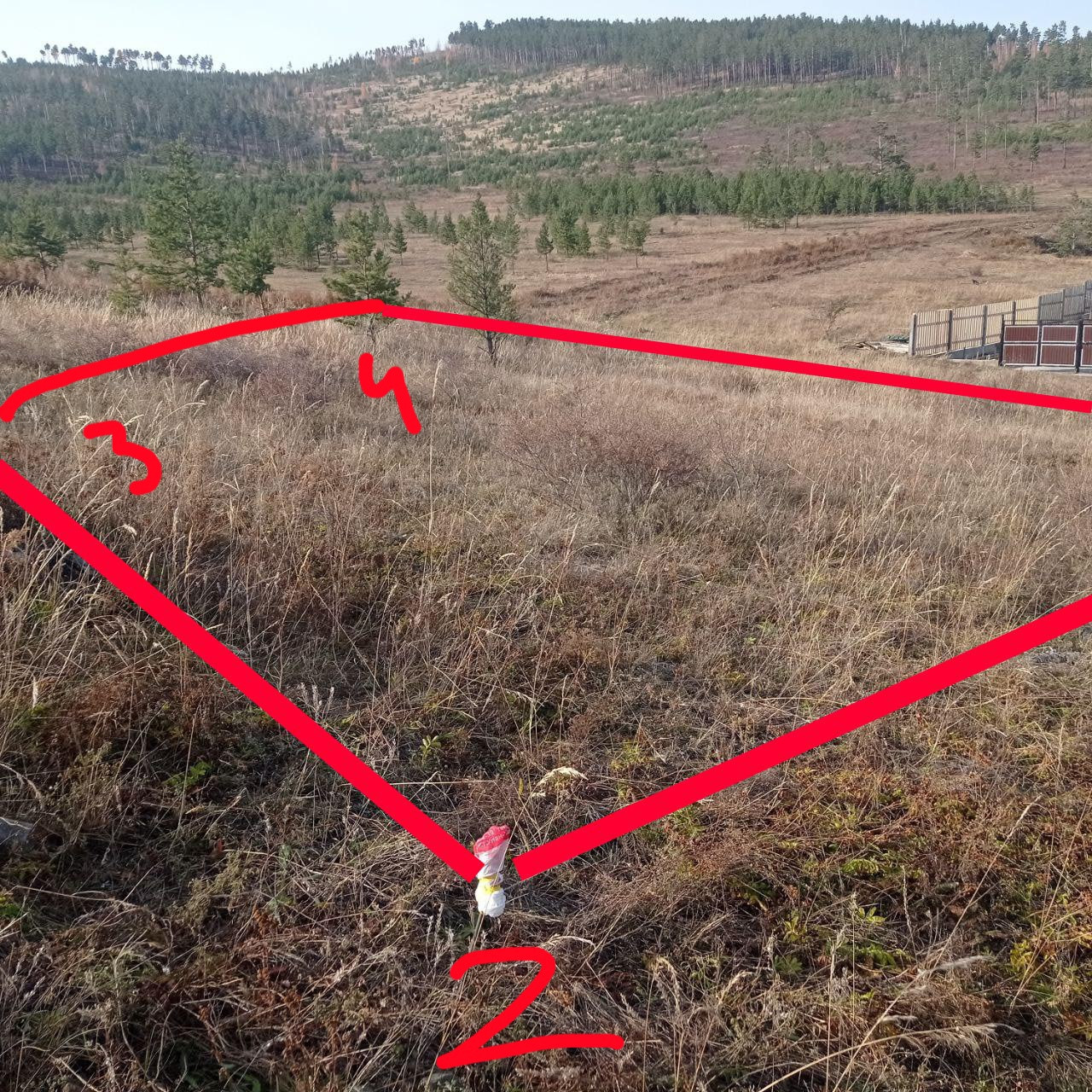 Небольшой уклон. Воду надо бурить. Столбы под свет рядом, требуется подключение. Не огорожен.