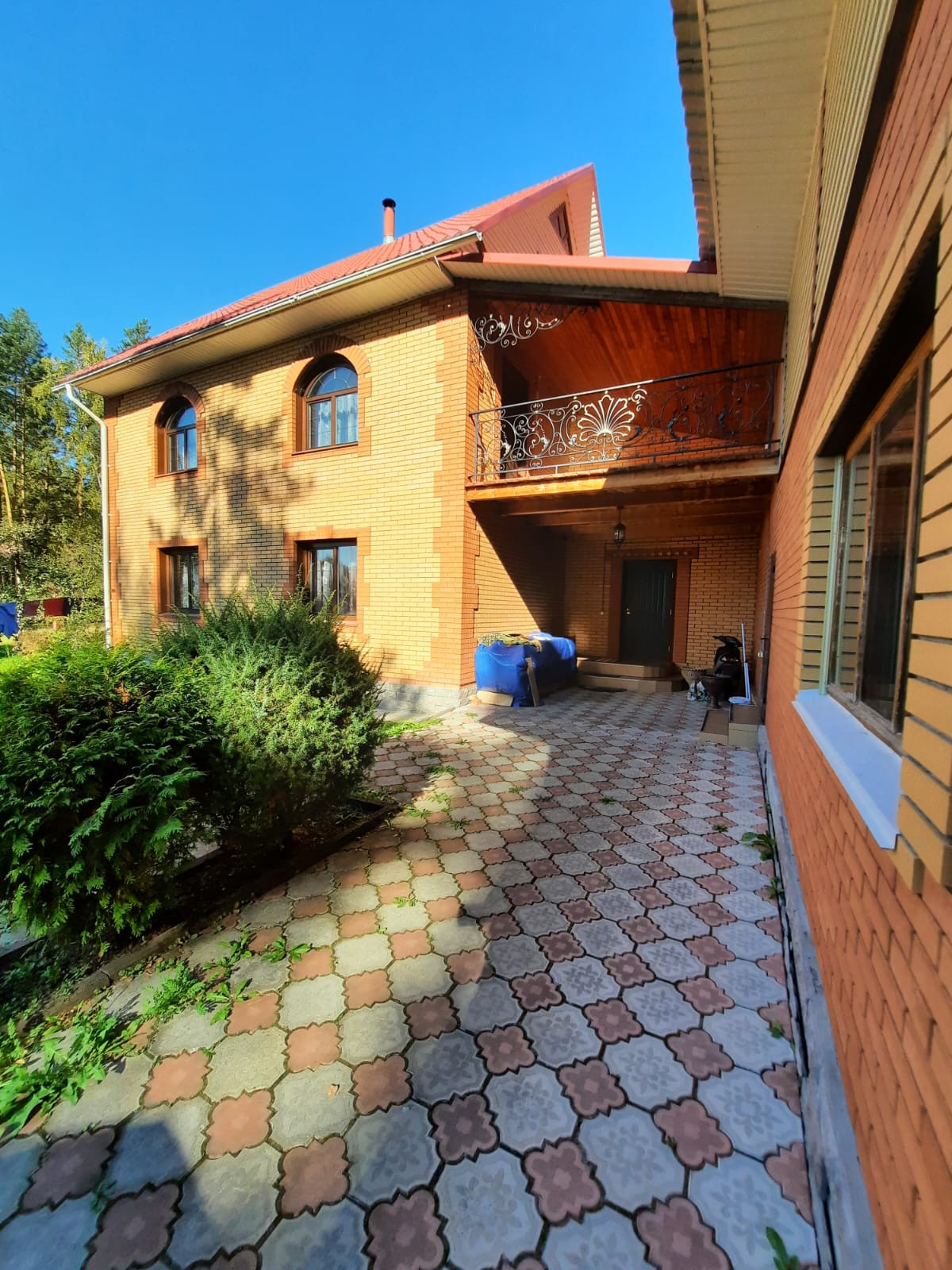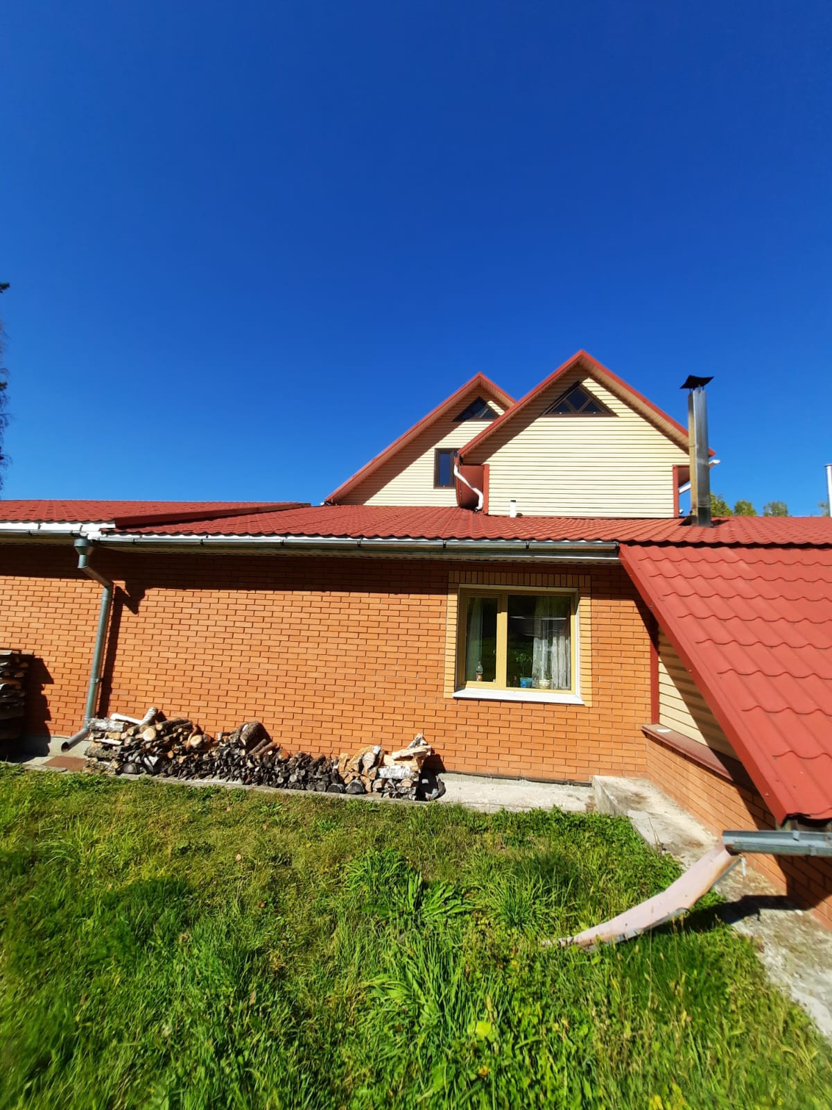 Построен в 2006 году из бруса с облицовкой из кирпича. В доме имеются 2 этажа и мансарда с террасой.