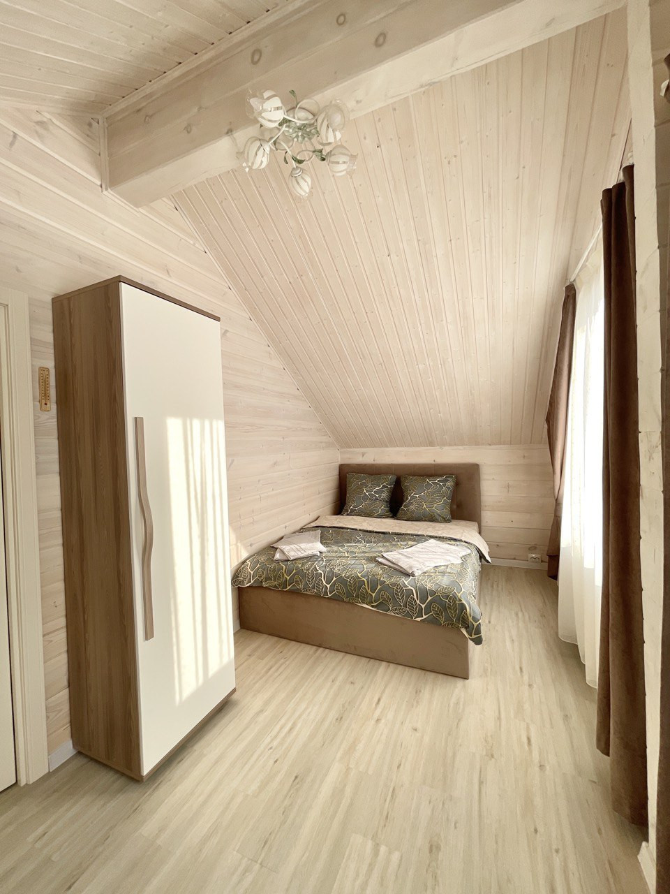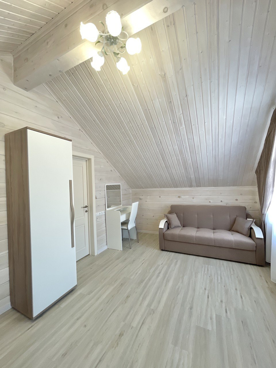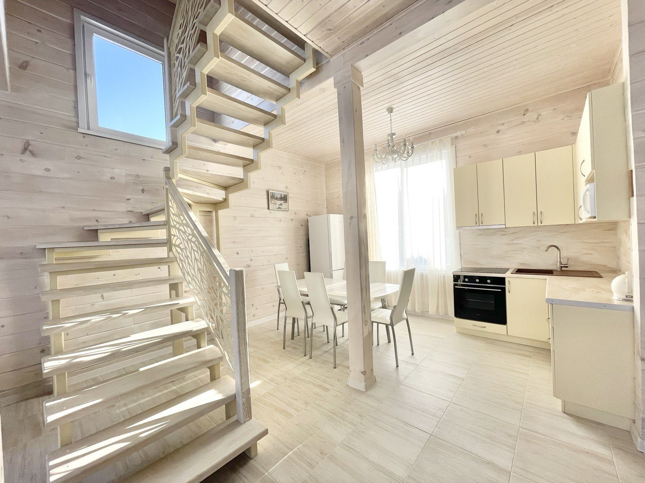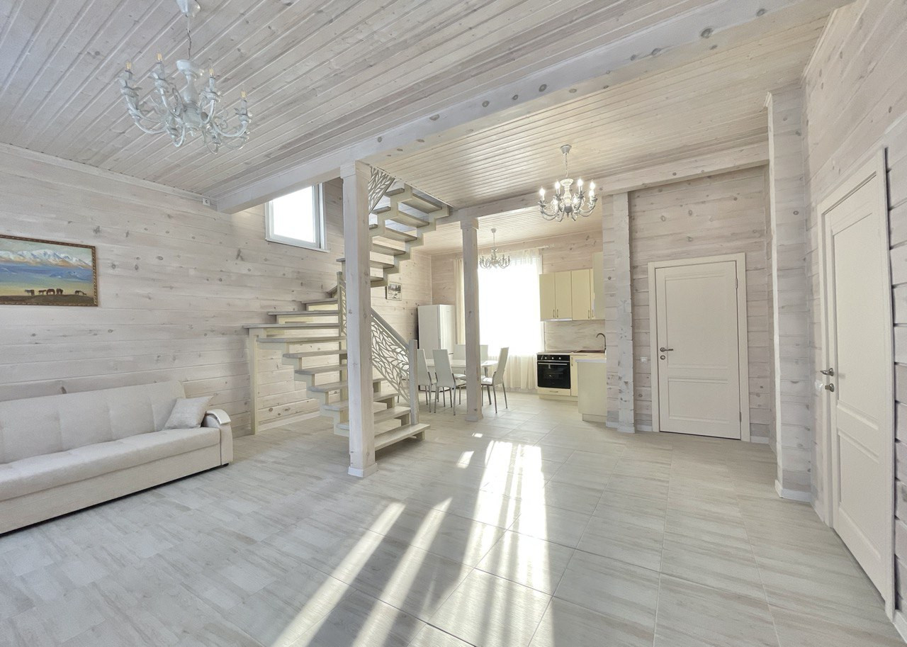 Дом в двух этажах: на первом этаже расположена просторная светлая кухня-гостиная, санузел а на втором этаже две  уютные спальни.