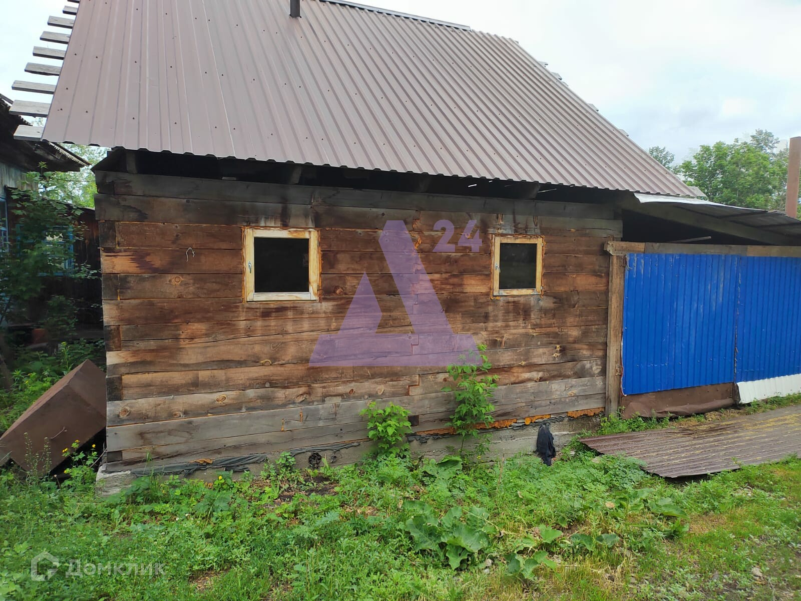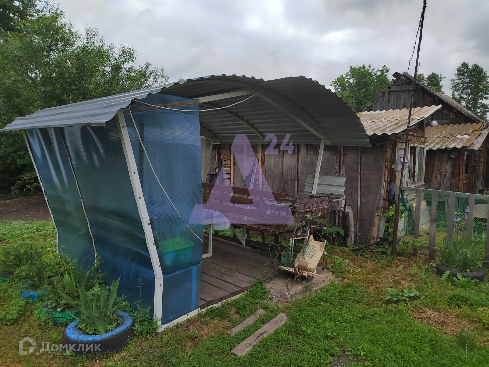 На большом участке 15 соток также находятся баня, беседка и хозяйственные постройки. Территория огорожена забором из профлиста. Есть большая площадка для парковки автомобиля.