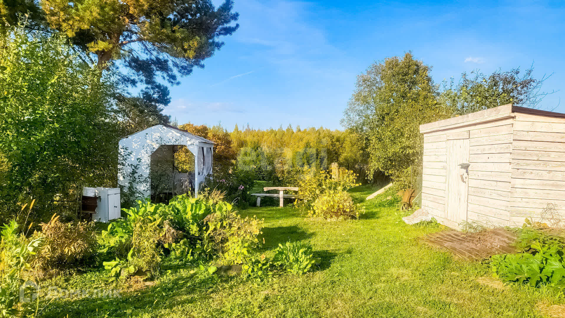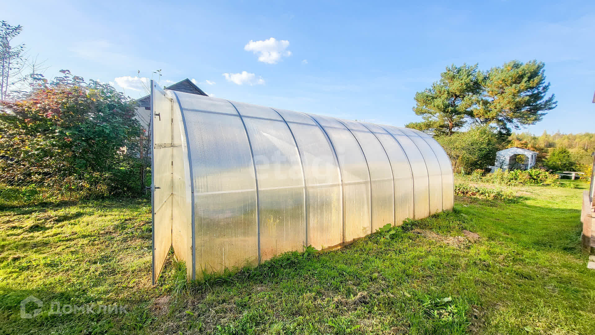 Земельный участок 9 соток обработан и огорожен забором. Имеется также теплица, беседка и сарай.