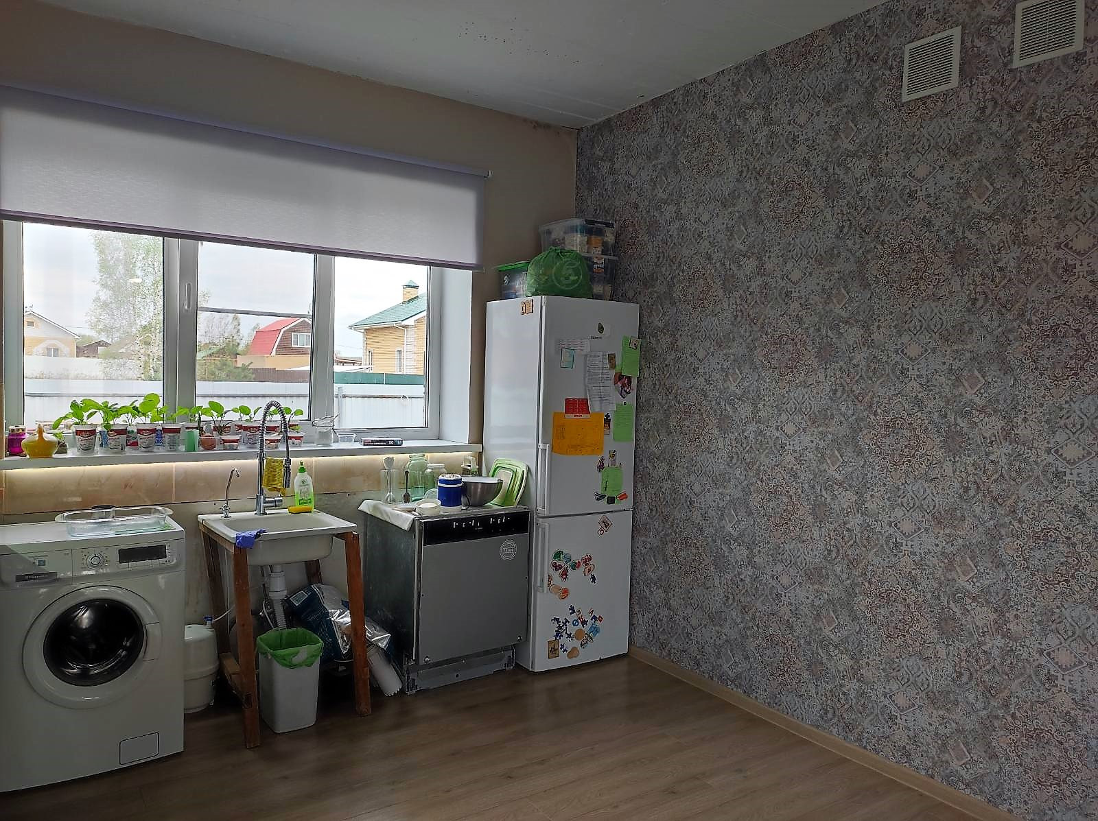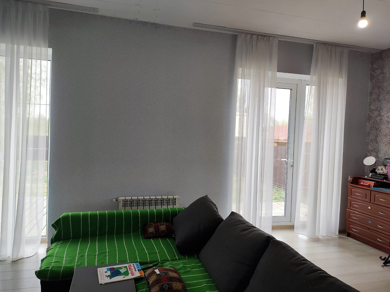 На первом этаже - просторная кухня-гостиная выходит на открытую террасу, спальня, санузел. На втором этаже - три спальни, санузел. В настоящее время отделан только первый этаж.