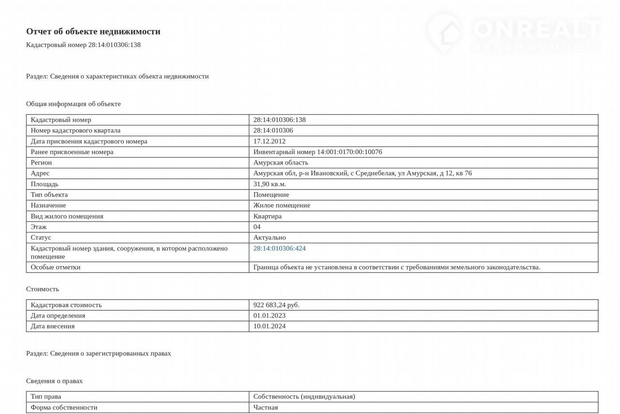 Стоимость недвижимости:
