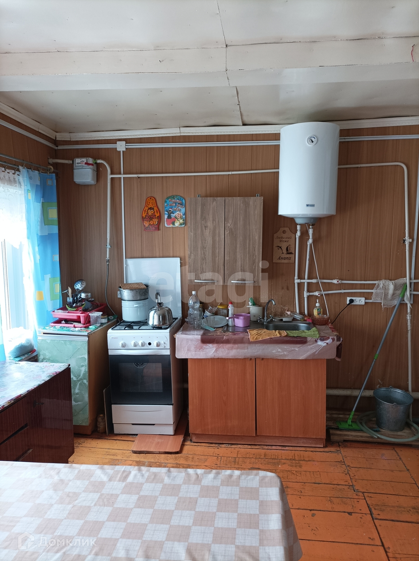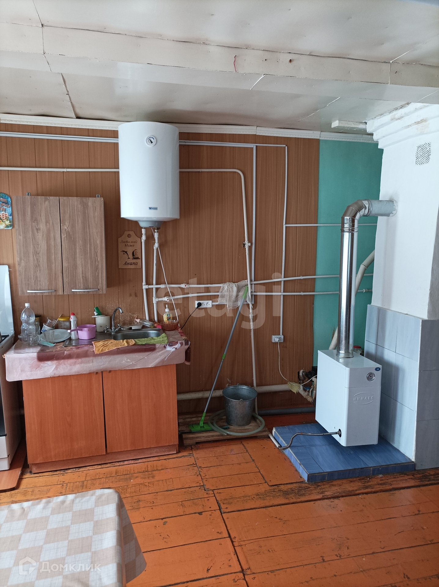 Высокие потолки, светлые стены оклеены обоями, полы деревянные, окна пластиковые стеклопакеты. Новый газовый котел для обогрева дома, система горячего водоснабжения-бойлер. Душевая кабина, унитаз в доме.