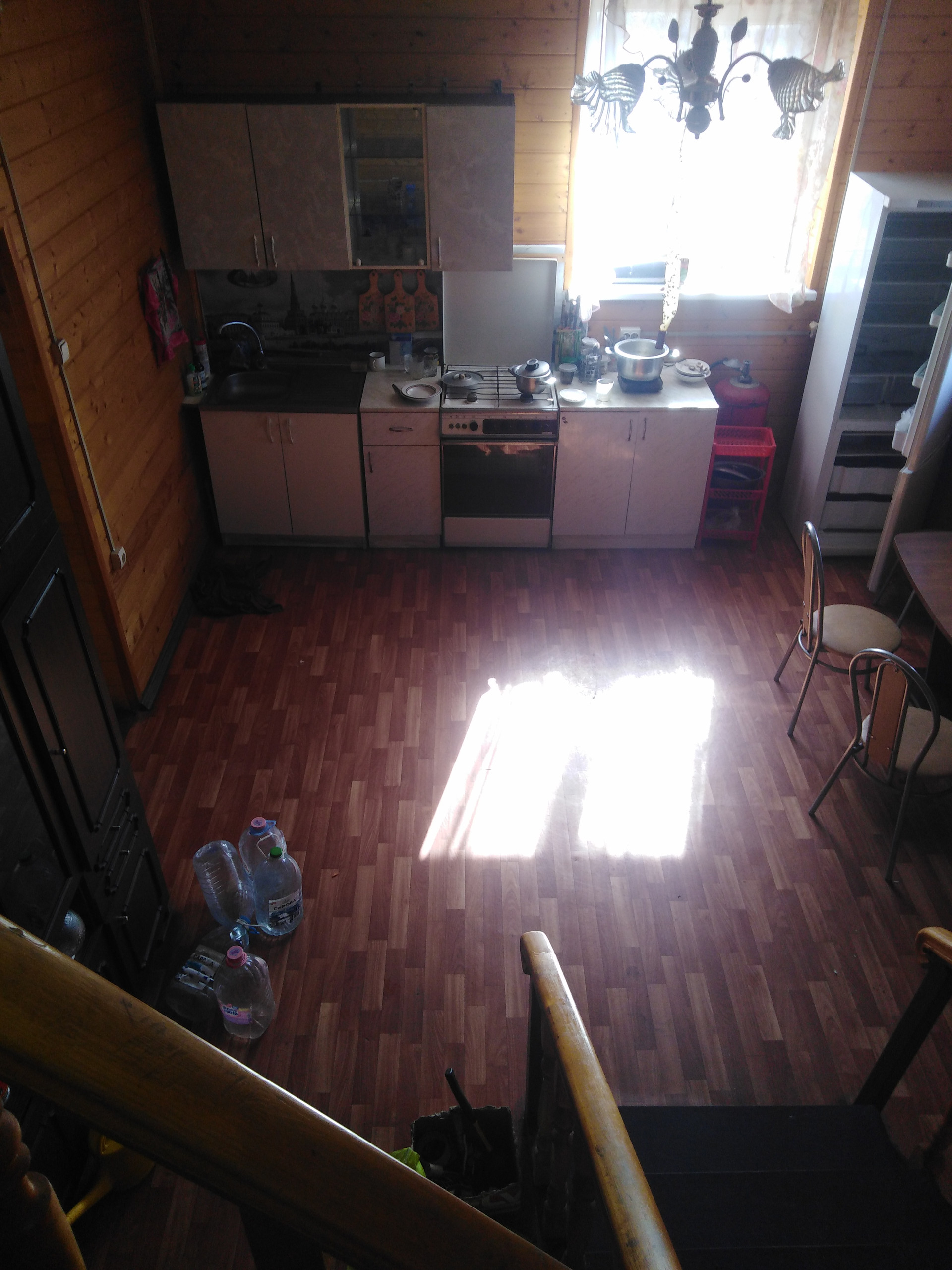 На первом этаже - при входе в дом с крыльца попадаем в холл из которого вход в комнату с камином и вход в большую кухню, из которой есть выход в огород, вход в сан. узел и лестница на второй этаж.