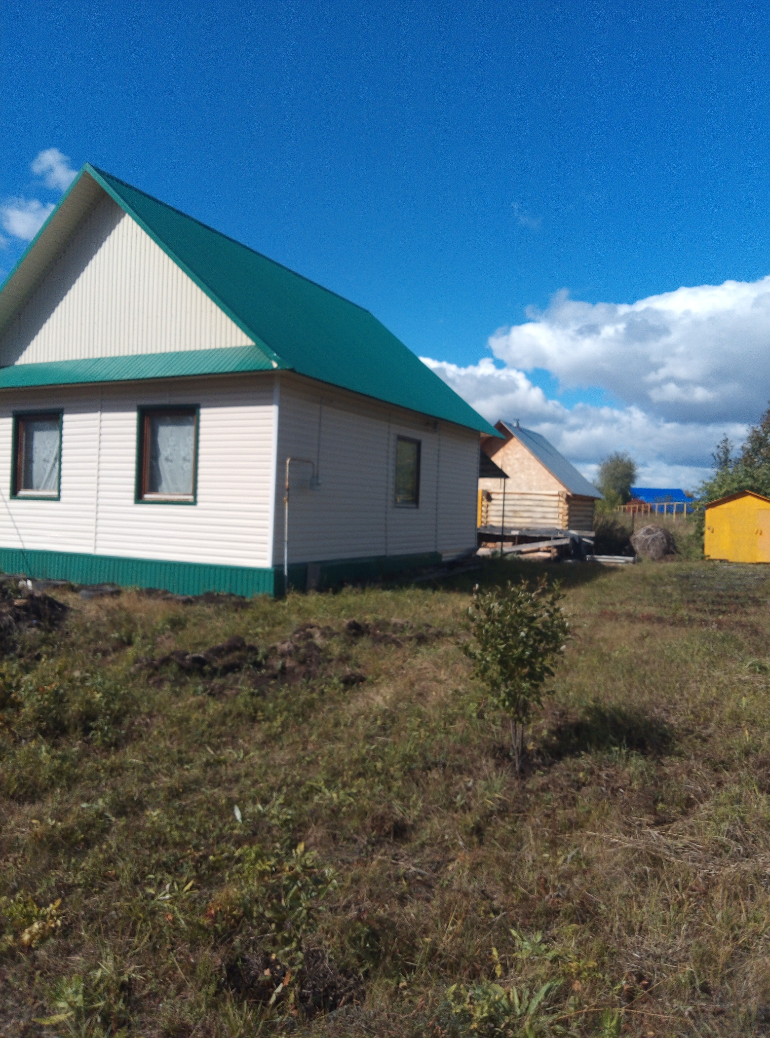 Дом новый  (брус 15х15) 7х6х2,8 ,  свет, вода, газ, канализация,  баня 3х4, участок 10 соток, насаждения.