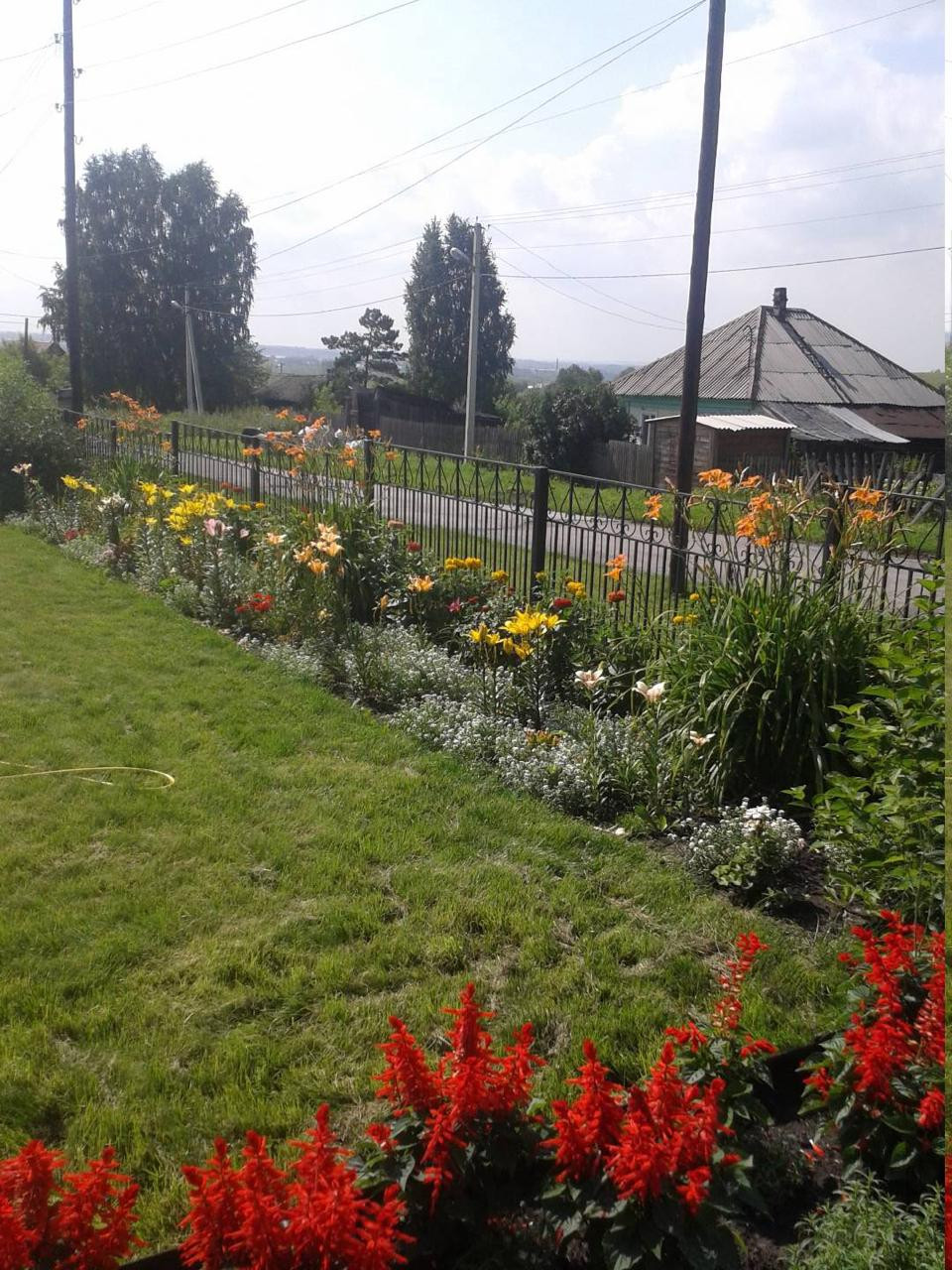 Ухоженый огород с цветами многолетниками, посадки яблони, вишни, малины, смородины.