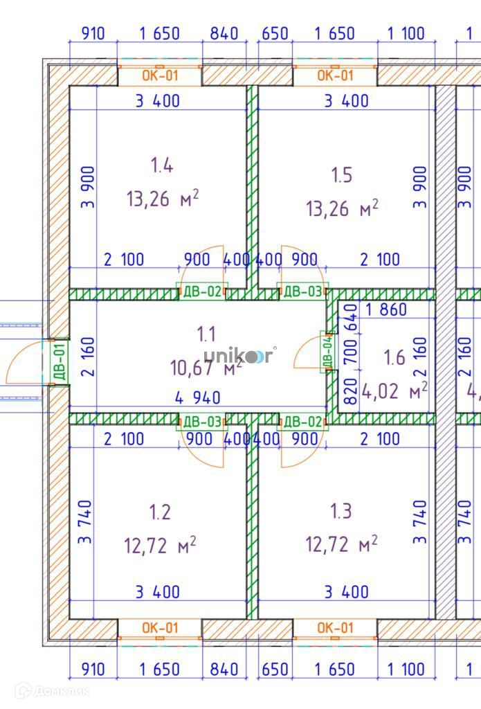 Кухня – 13,26 м2, спальни по 12,72 м2 и 13,26 м2, с/у – 4,02 м2, коридор - 10,67 м2;