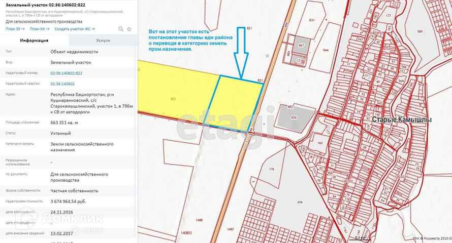 Продам земельный участок 0.5га в земельном наделе общей площадью 66га. Земля в собственности. До настоящего времени использовался для сельскохозяйственного производства. Участок находится на пересечении дорог Уфа-Подымалово-Благовещенск и Старые Камышлы-с.Гуровка, через дорогу от с.Старые Камышлы. Имеется утвержденный пакет док-тов перевода 20га, примыкающих к трассе, в земли для промышленного использования и размещения станции АЗС, придорожного отеля, кафе, торгово-сервисного комплекса. Электросети по периметру участка, газовая сеть в 100 м, асфальт до участка.