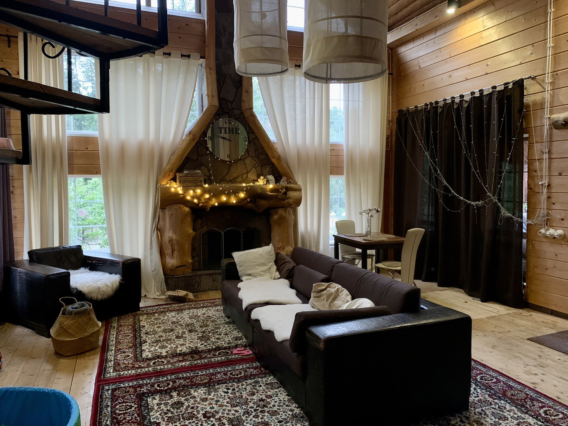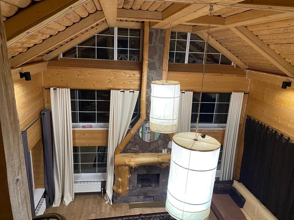 1 этаж - просторная гостиная с действующим камином и вторым светом, ещё одна комната, санузел и кухня.