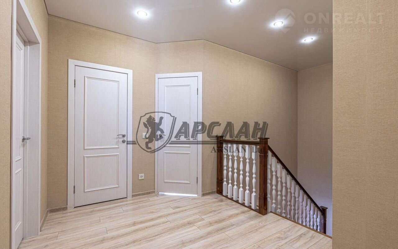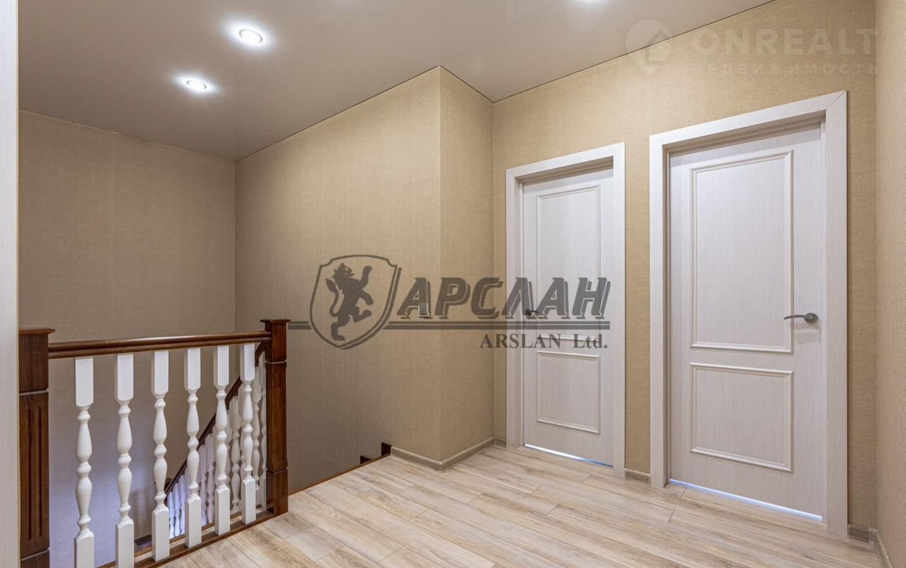 На 1-ом этaжe: 1 cпaльня, большая кухня-гостиная, сан.узел с душевой кабиной. Теплые полы по всему периметру первого этажа (экономичное отопление). Входная группа. На 2-ом этаже: 3 спальни, кабинет, санузел с душевой кабиной, выход на чердак. Установлены пластиковые двухкамерные стеклопакеты, водоснабжение: скважина на 4 дома. В дом заведён газ, установлен двухконтурный котёл.