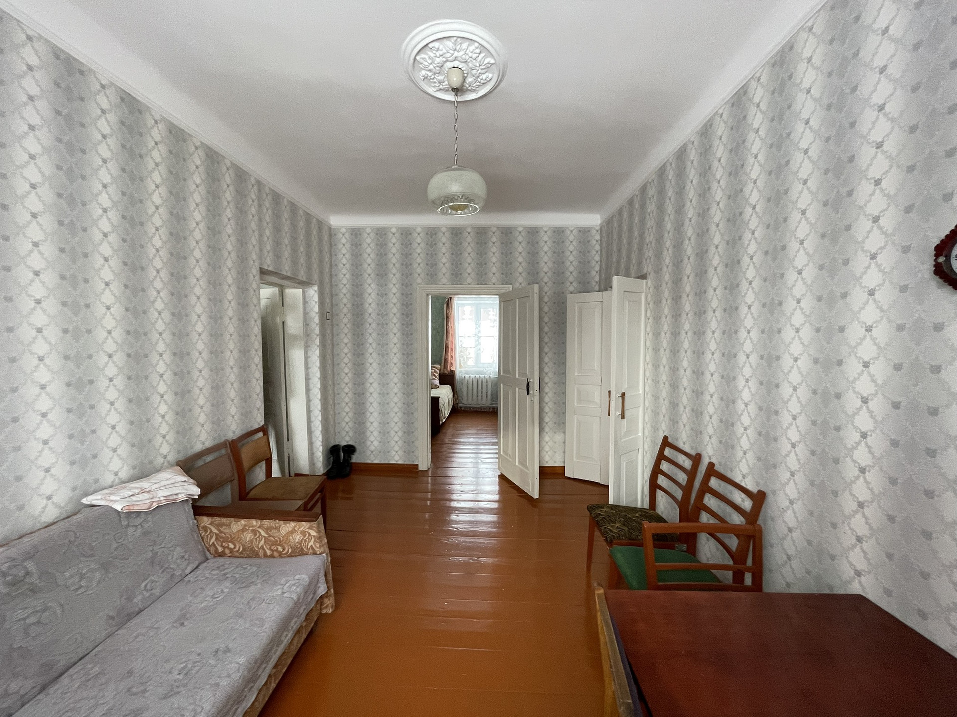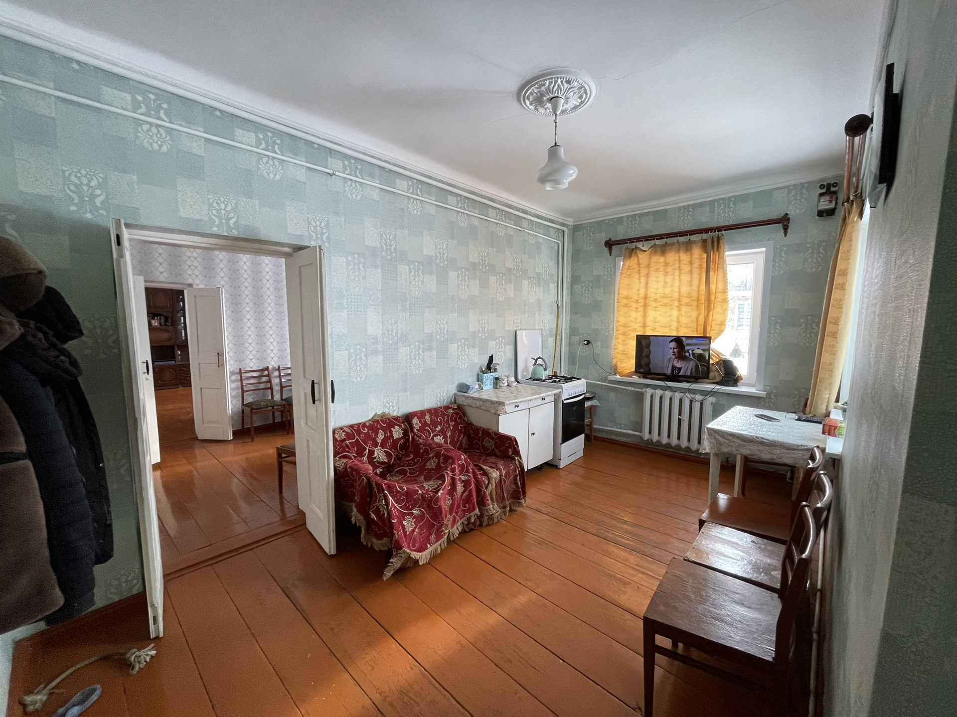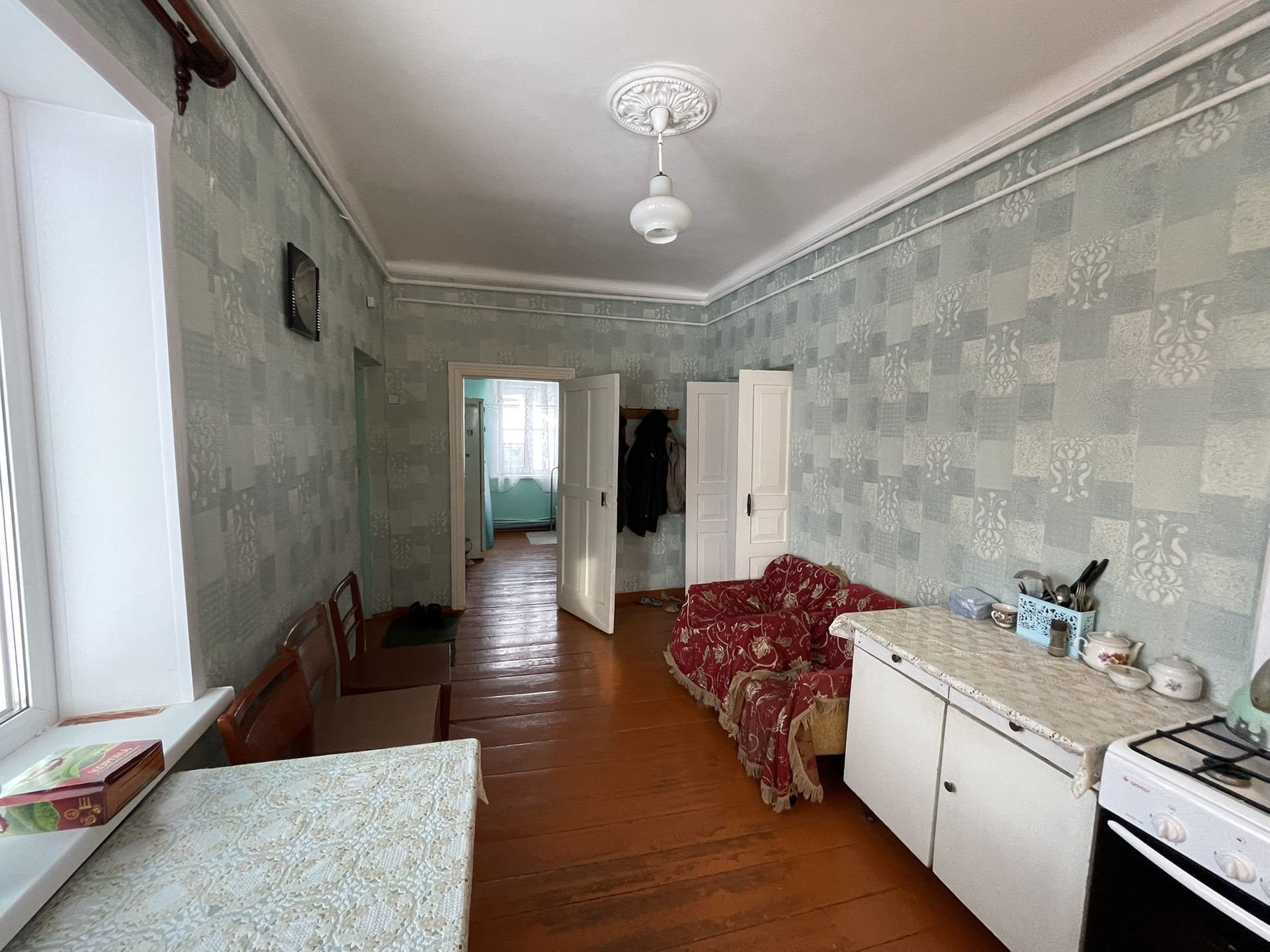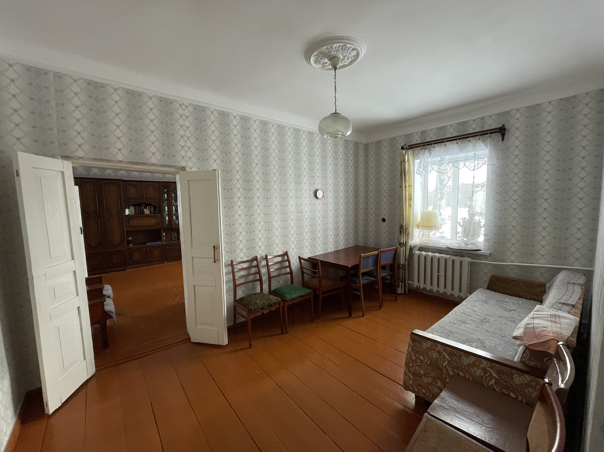 4 комнаты, столовая, туалетная комната, хол. коридор, кладовая. Газ, вода, удобства, печь. Прописанных нет.