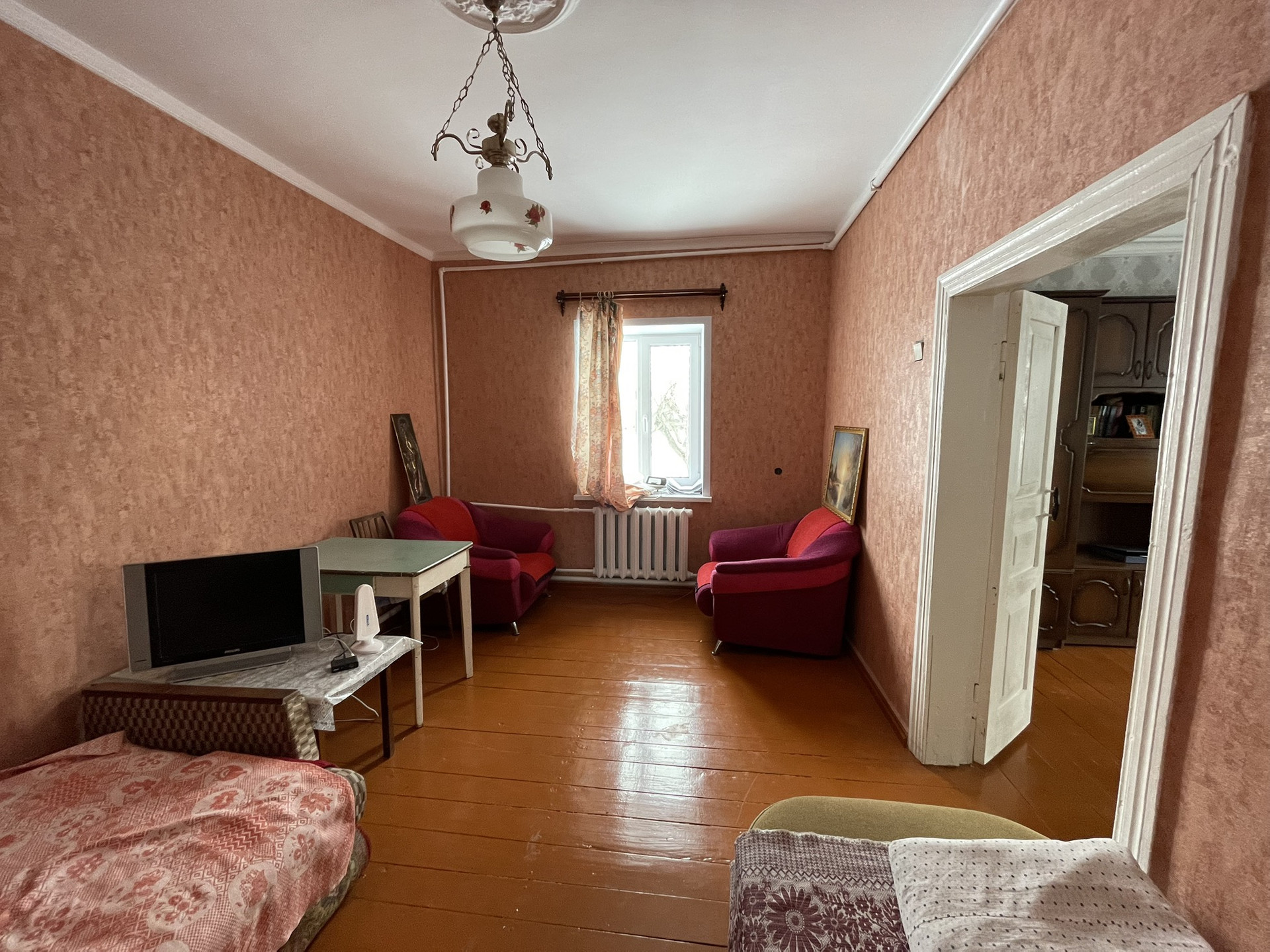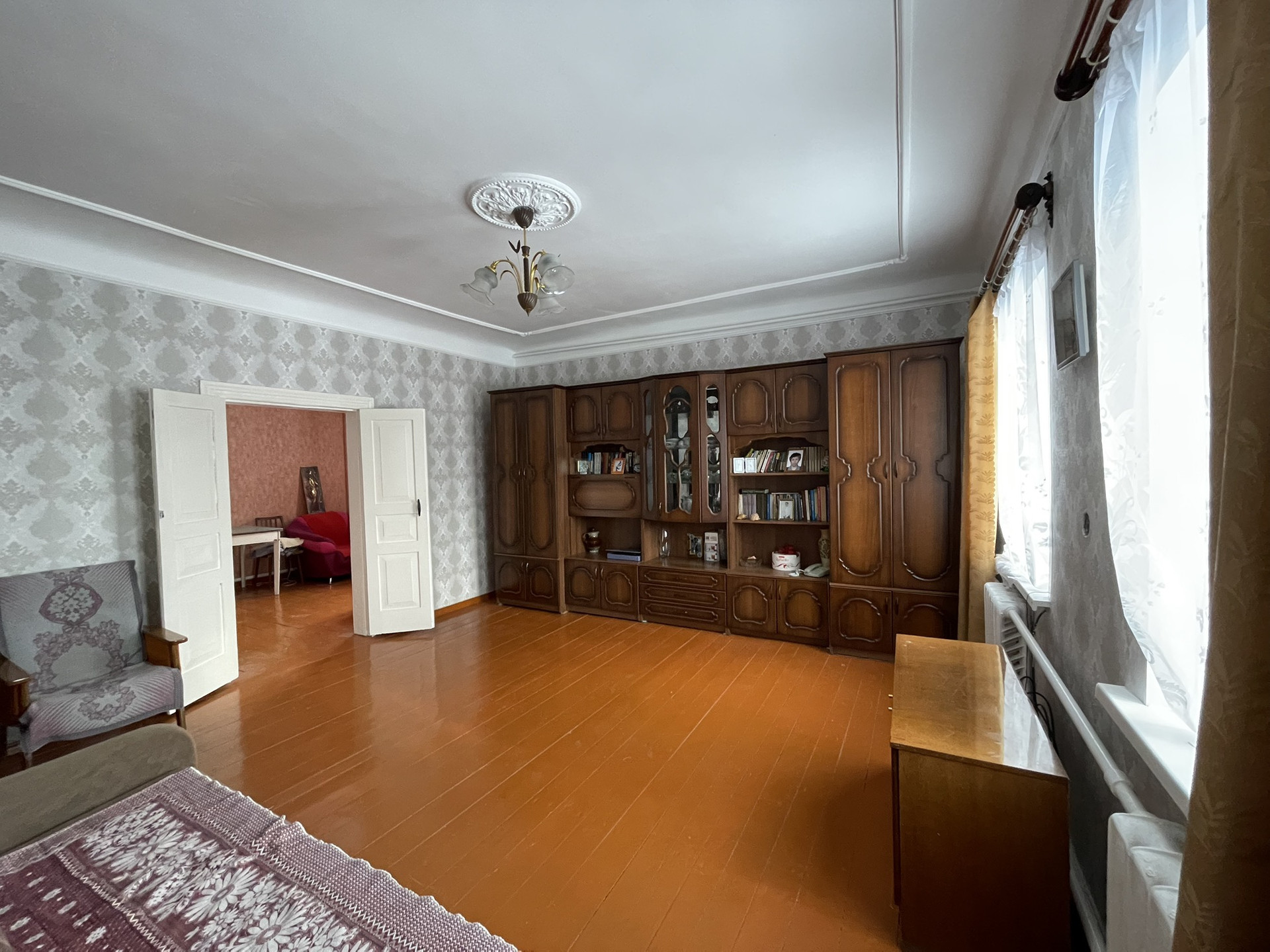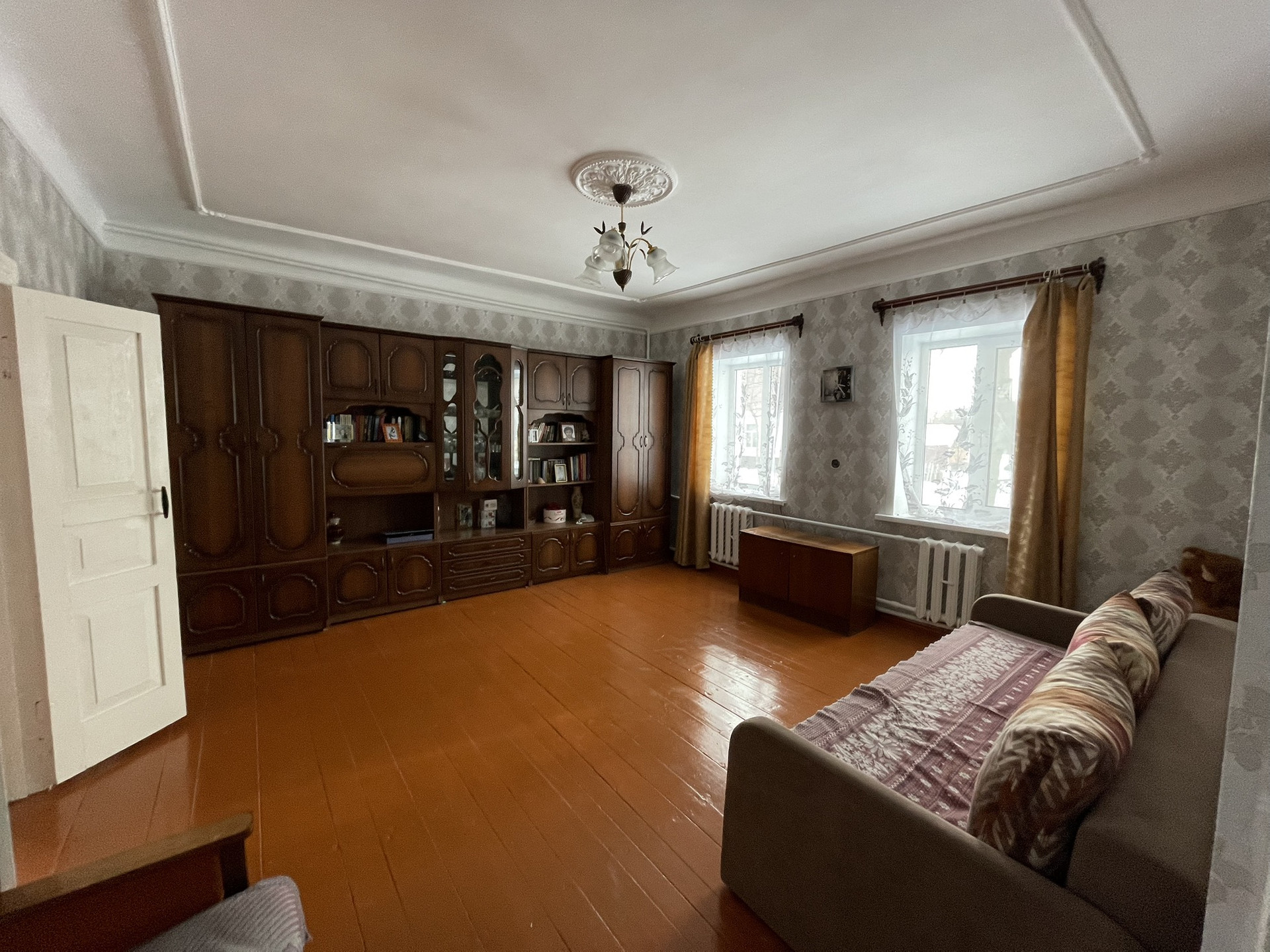 4 комнаты, столовая, туалетная комната, хол. коридор, кладовая. Газ, вода, удобства, печь. Прописанных нет.