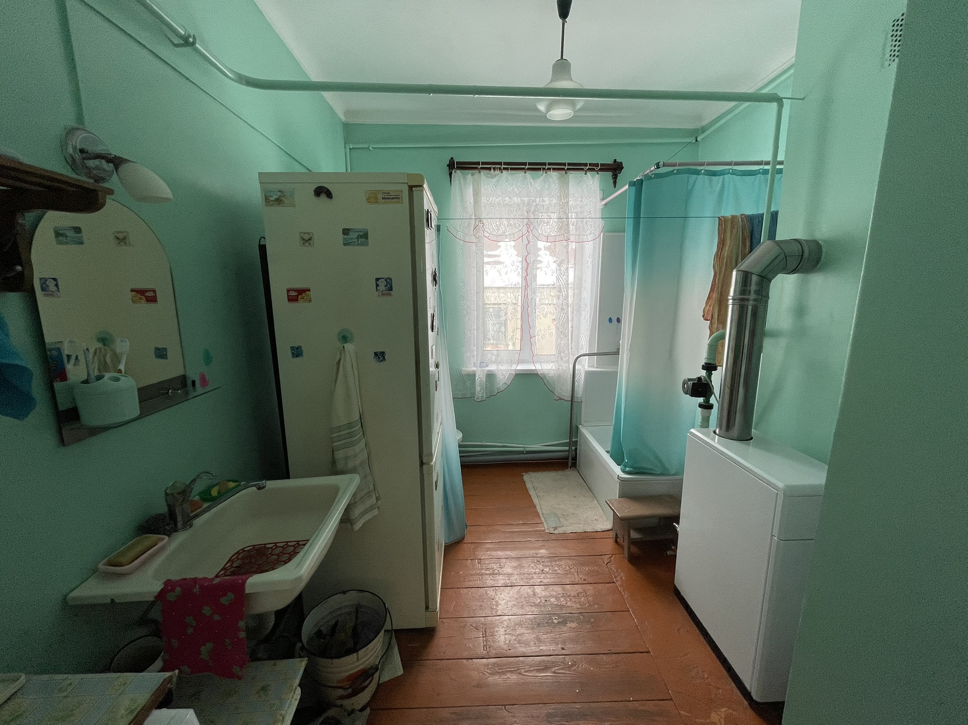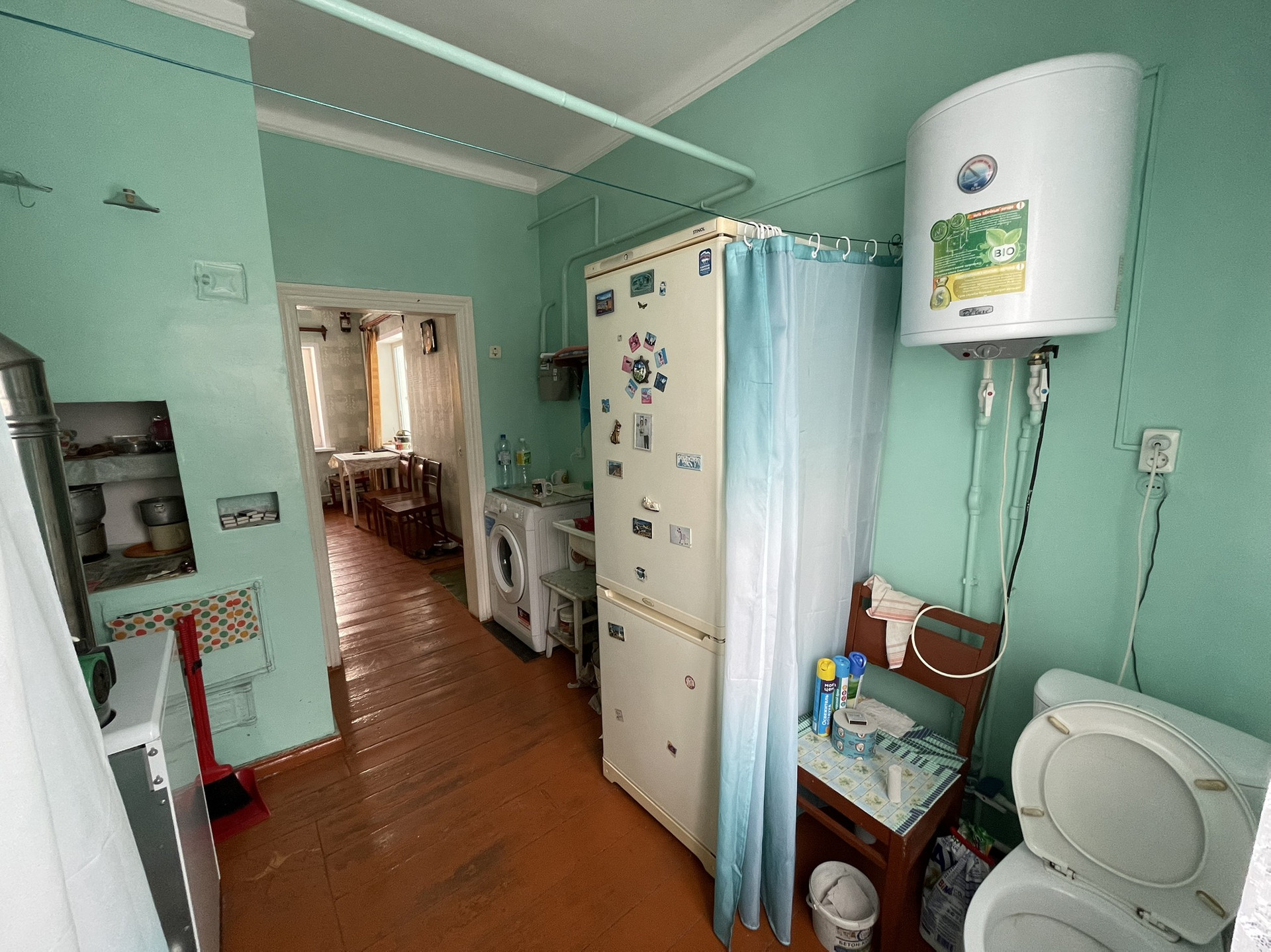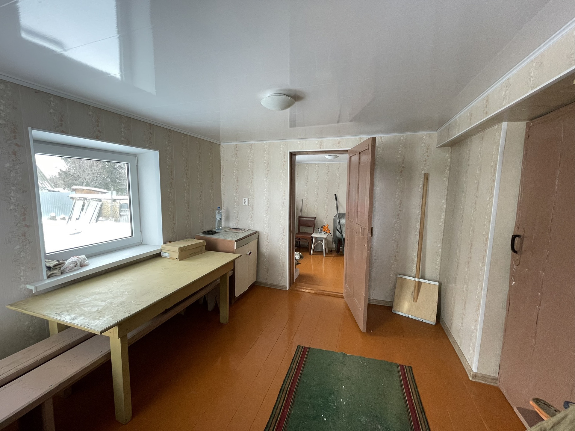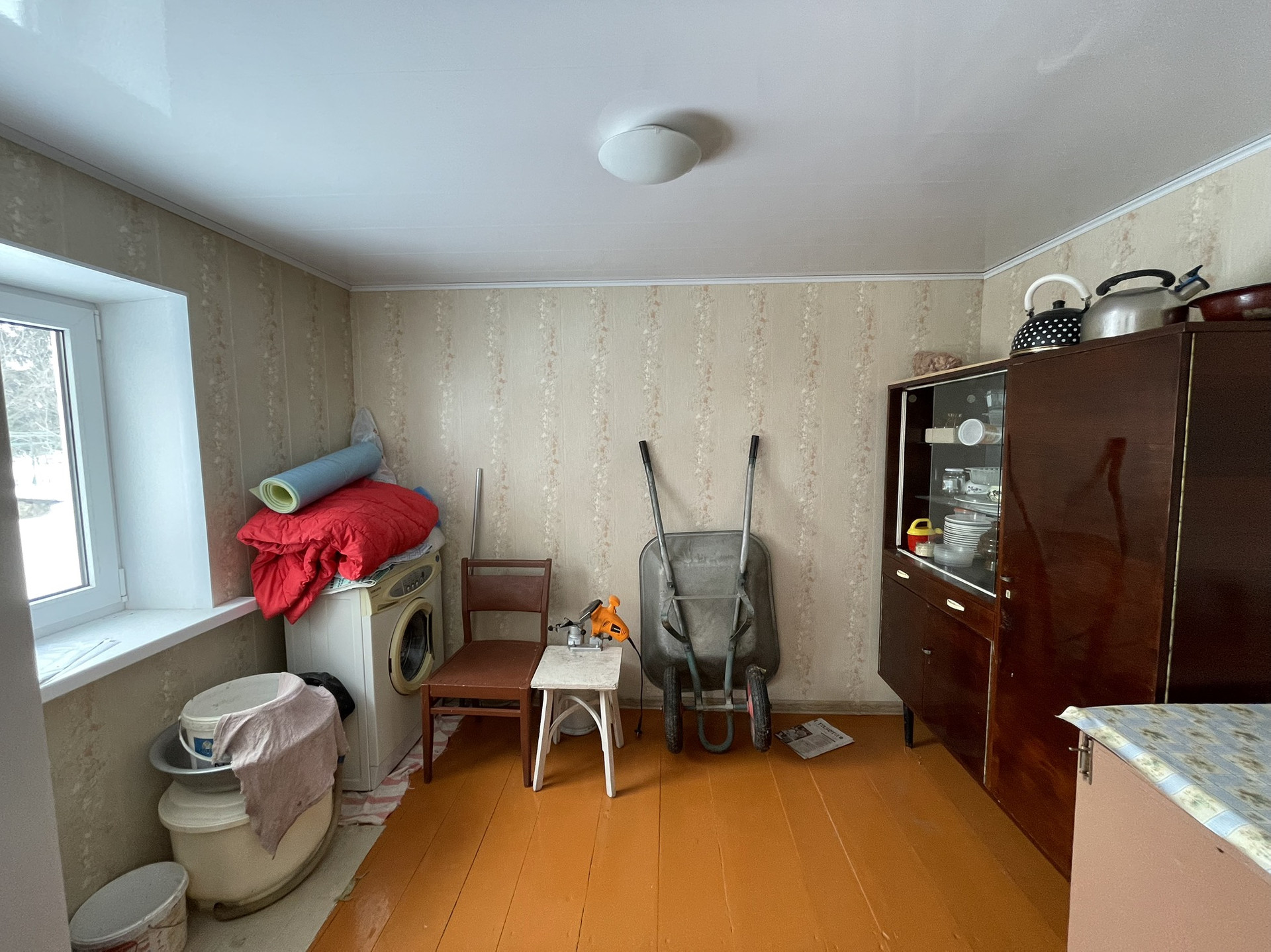 4 комнаты, столовая, туалетная комната, хол. коридор, кладовая. Газ, вода, удобства, печь. Прописанных нет.