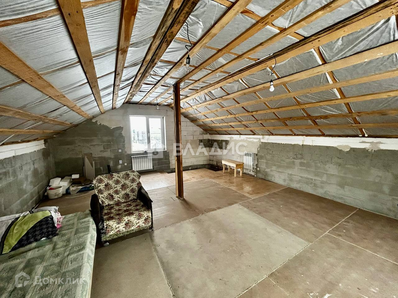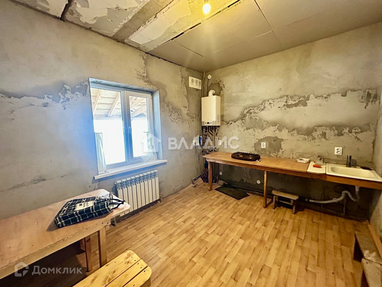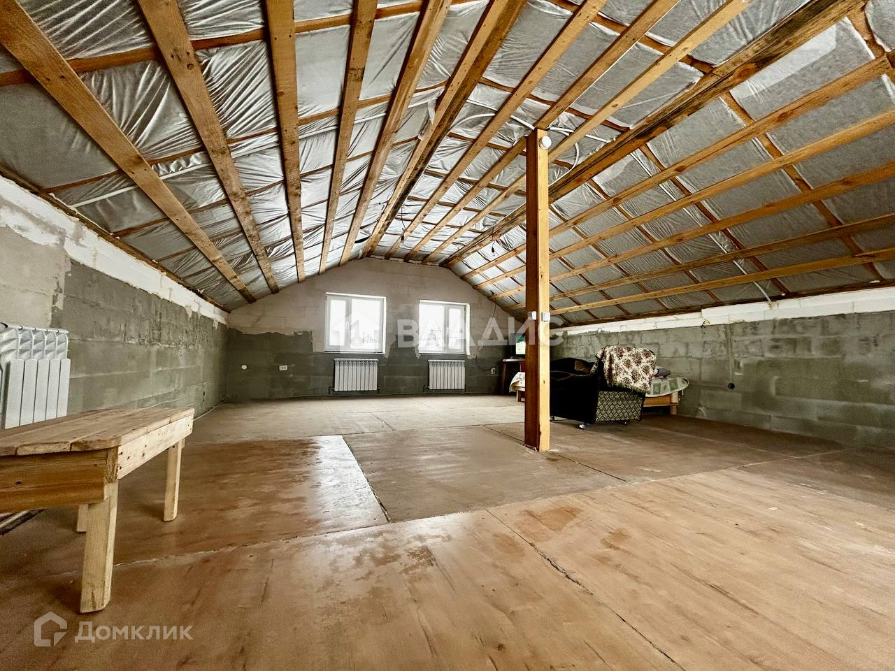 Внутреннее состояние дома: общая площадь 77м2. В доме 1 спальня на первом этаже и свободная планировка на втором, кухня 12.1, коридор, совмещенный с/у. На  полу линолеум. Стены отштукатурены. Окна ПВХ.