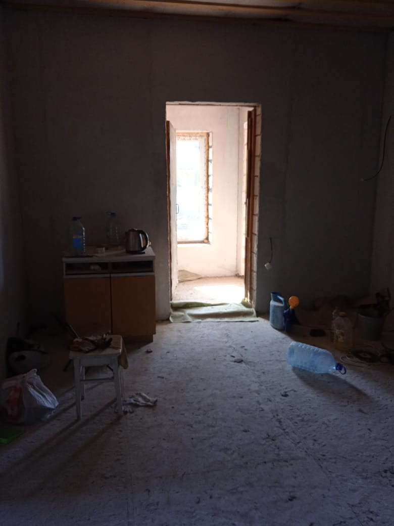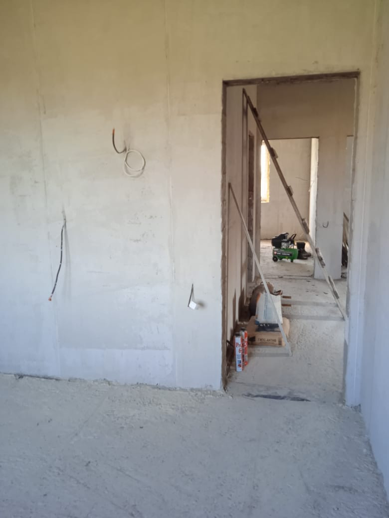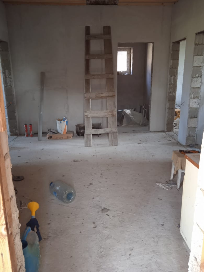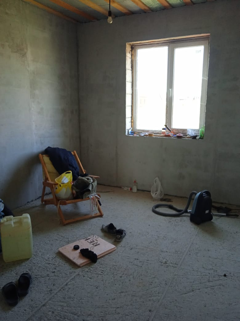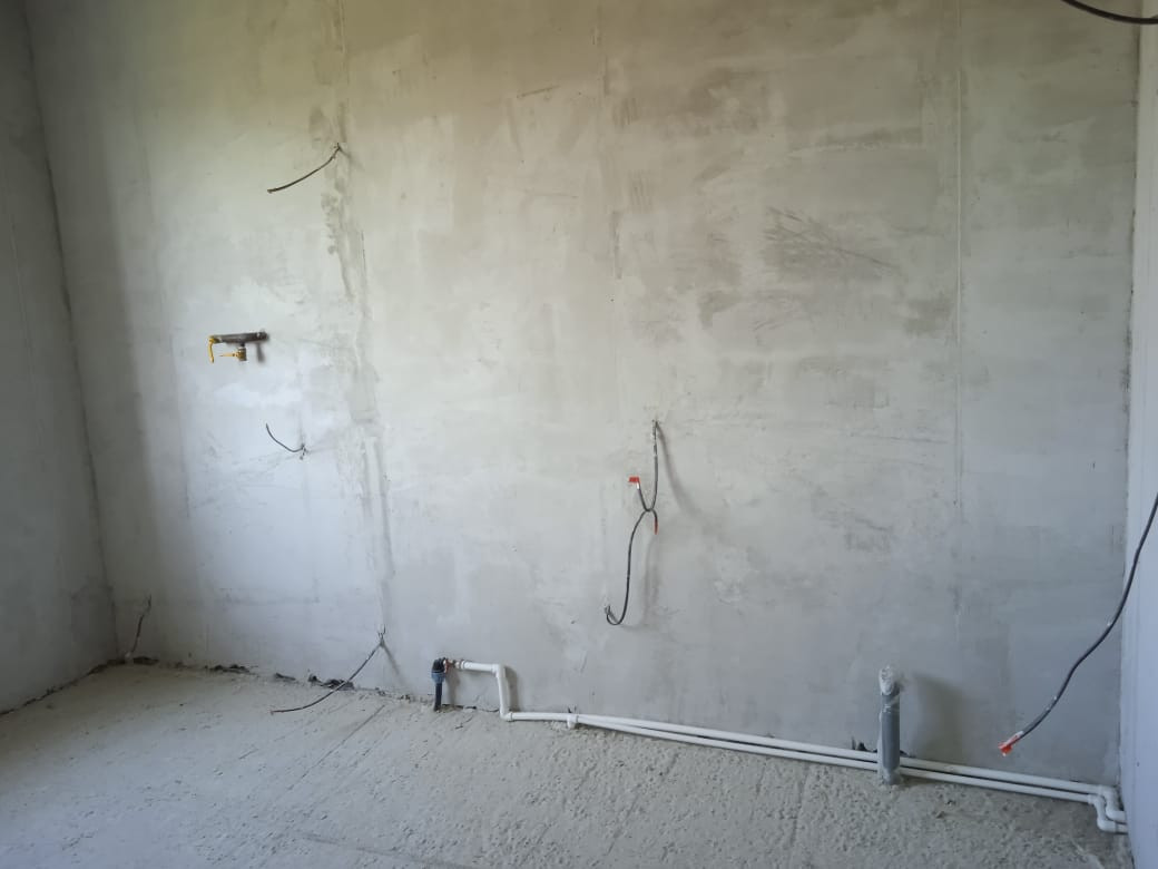 Полы выровнены, залиты черновой стяжкой. Стены выровнены, оштукатурены.