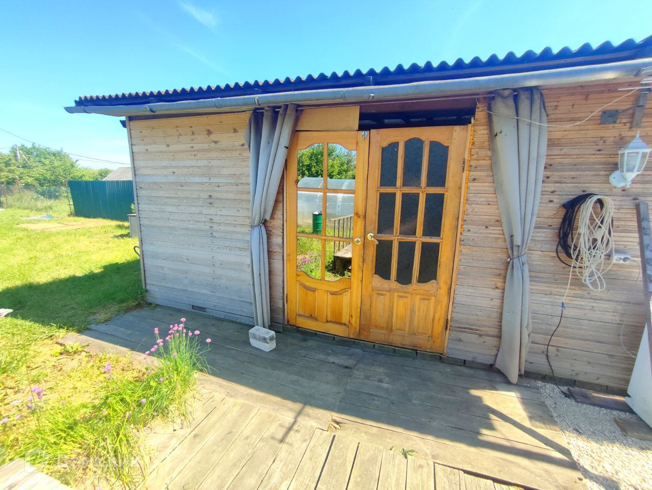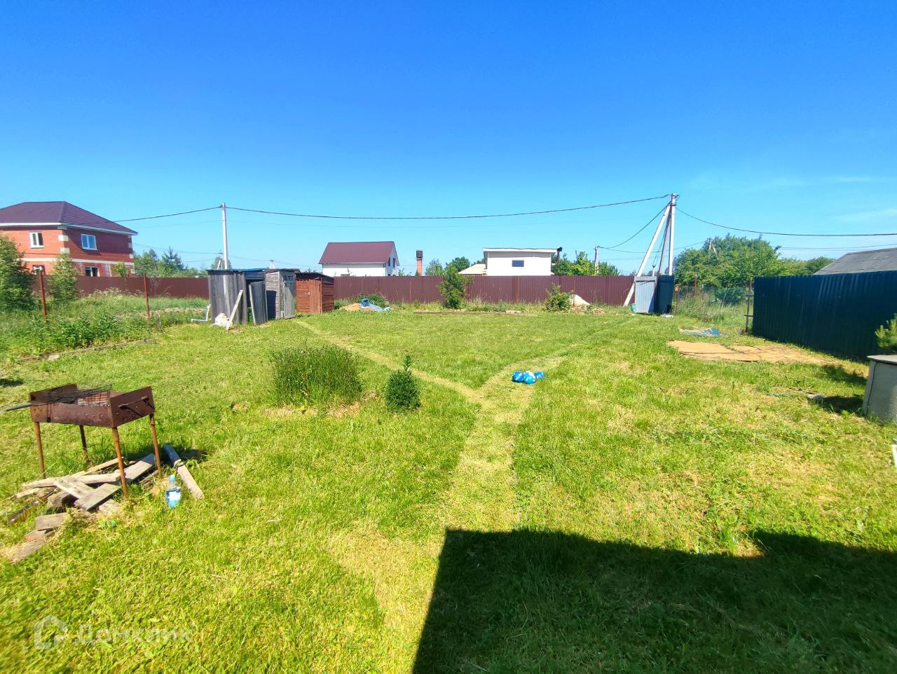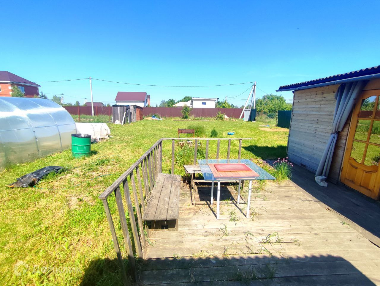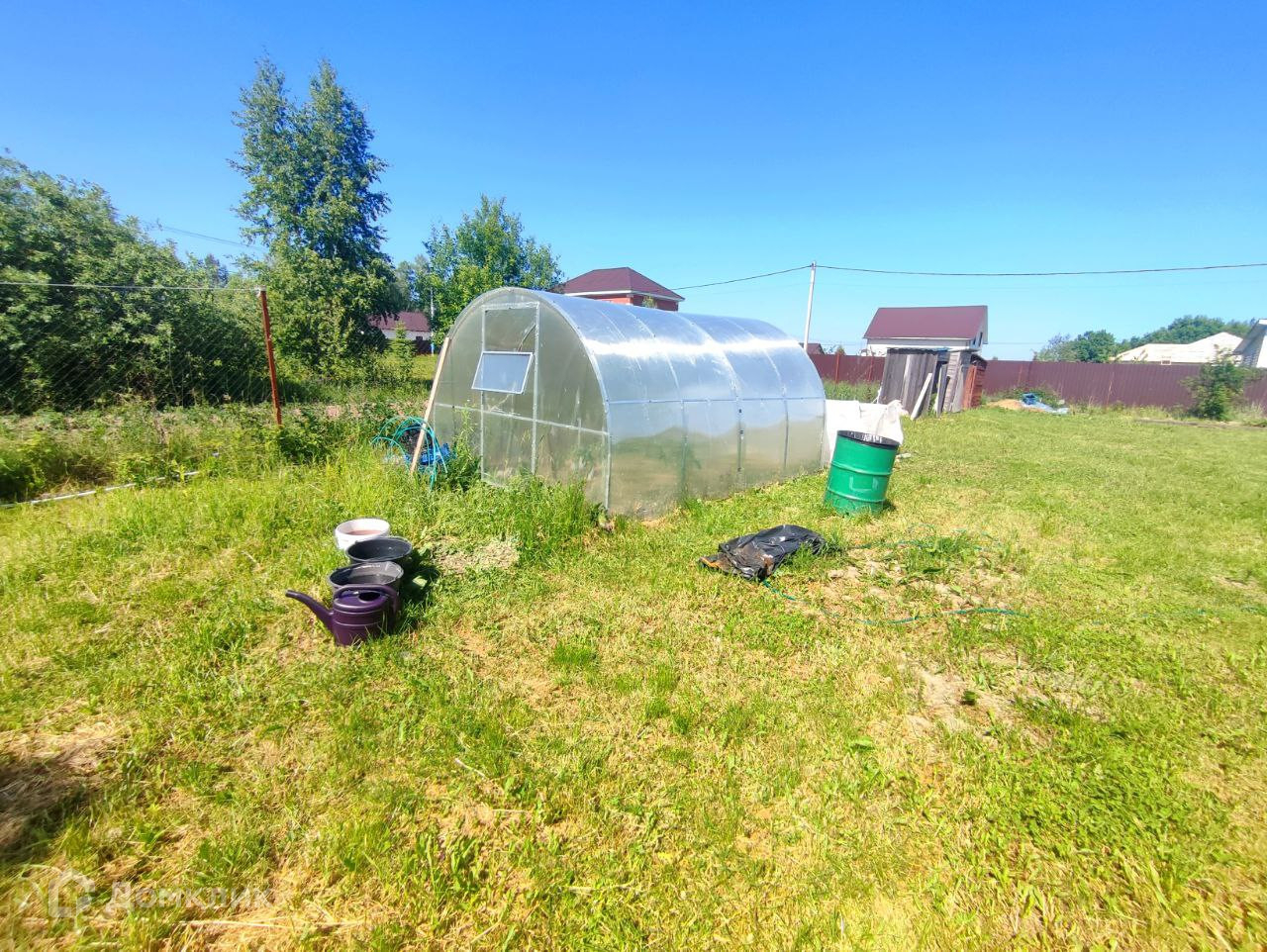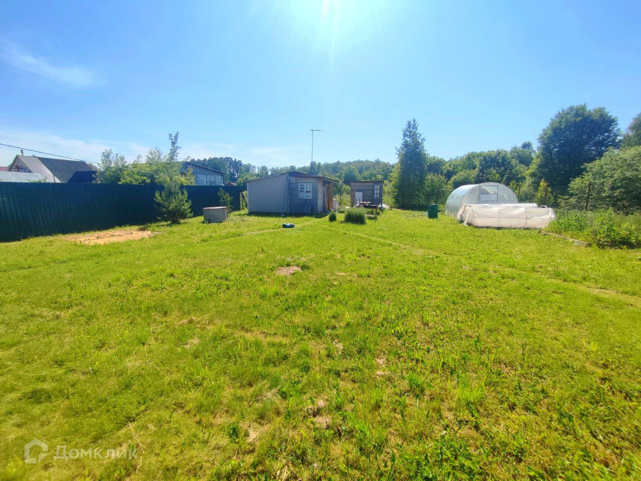 Участок ровный, газон, есть теплица, грядки, много свободного места,