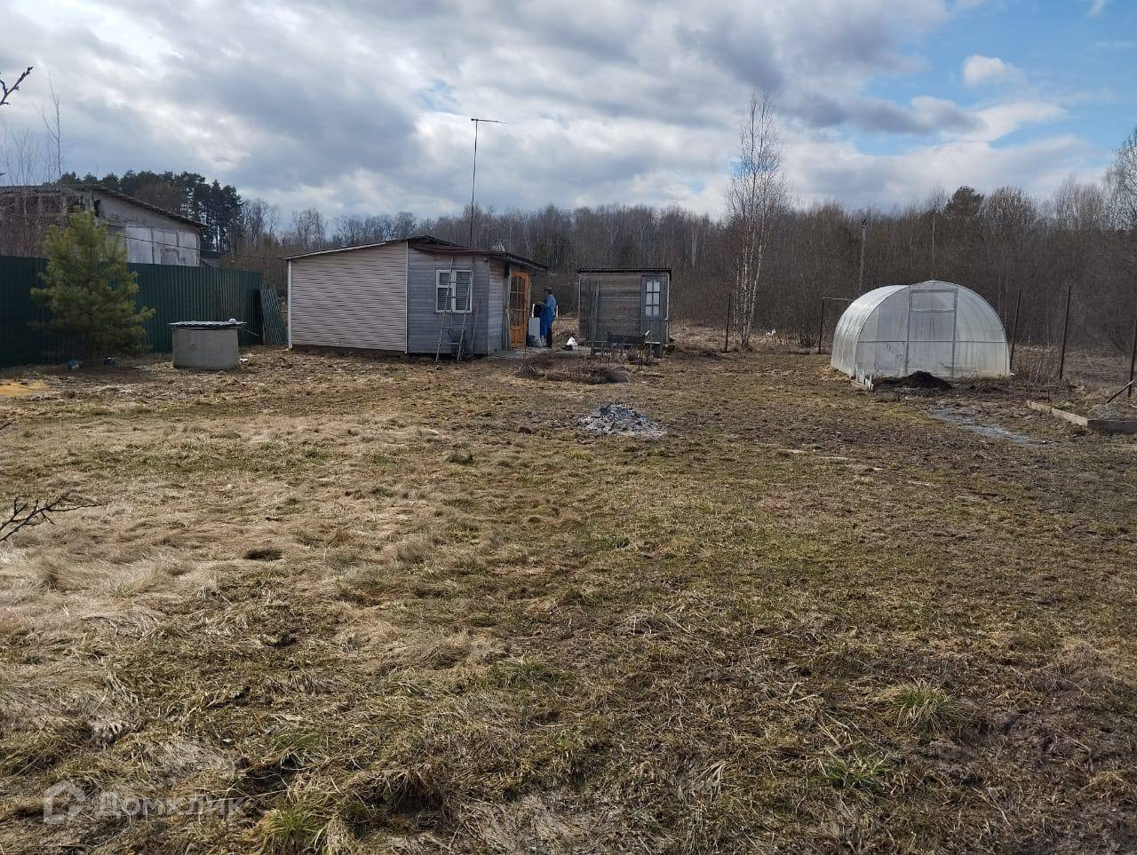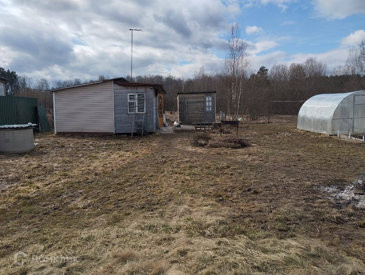 Участок ровный, газон, есть теплица, грядки, много свободного места,