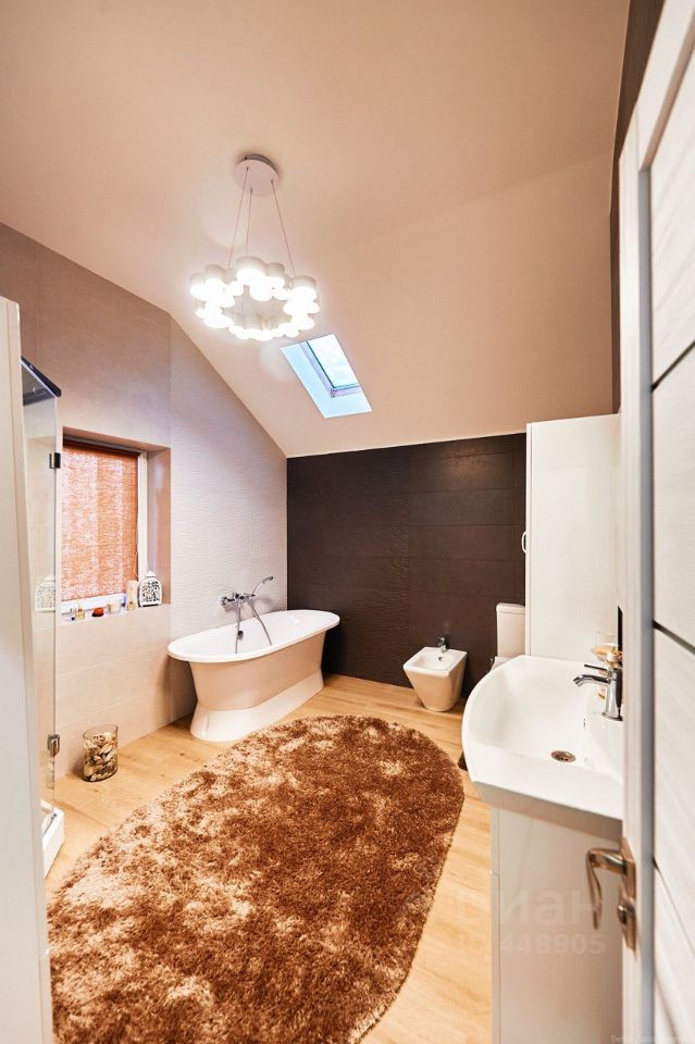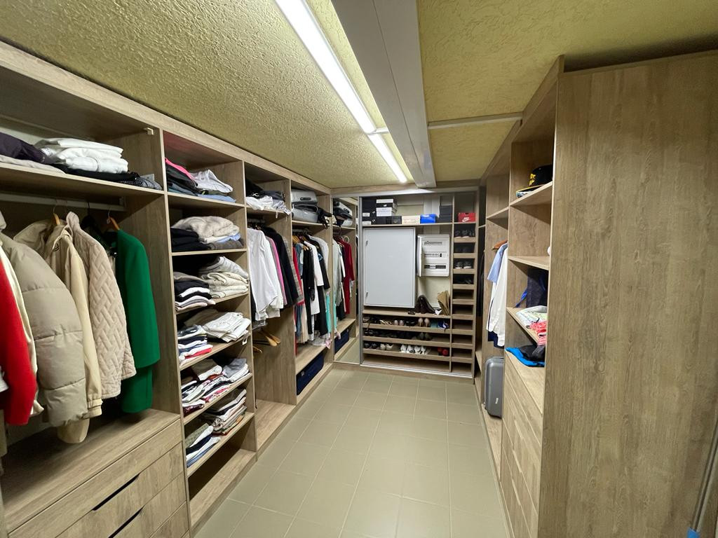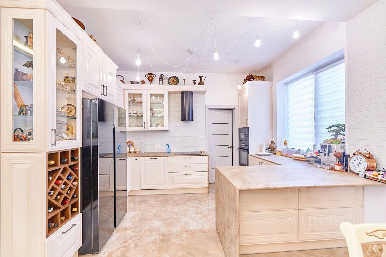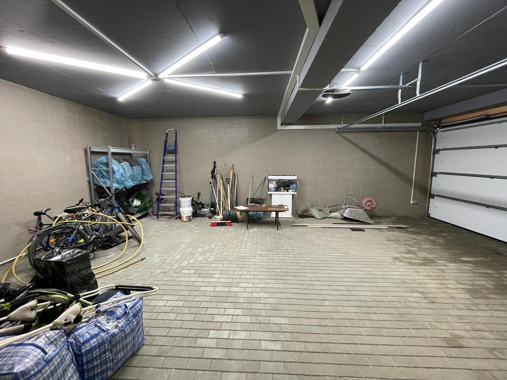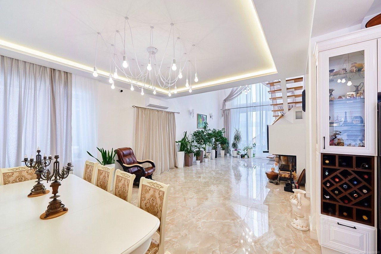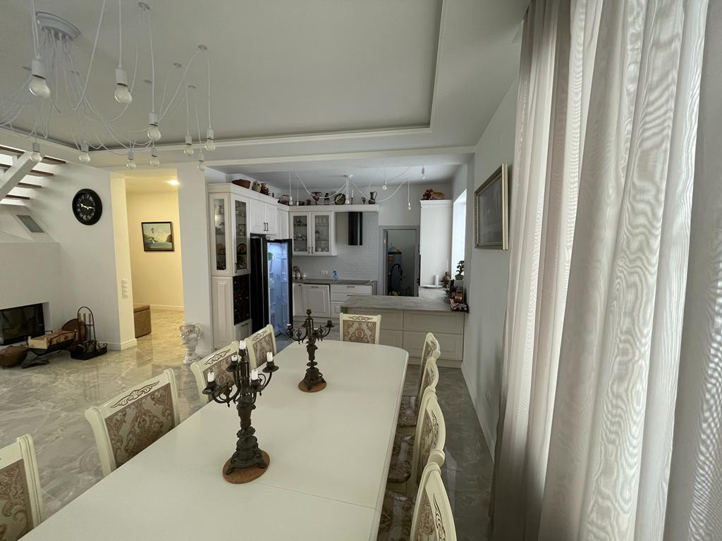 Двор с автоматическими воротами, вымощен тротуарной плиткой. Дом состоит из трех этажей: Цокольный этаж: Отапливаемый, тех помещение для стирки и глажки, большая гардеробная комната, зона хоз. хранения, подвал 30 кв м., насосная с емкостью 1,5 м куб. и системой фильтрации. Имеется выход в гараж. 1-й этаж: уютная гостиная с натуральным камином, санузел с душевой, прихожая, кухня-столовая с выходом на террасу и на летнюю площадку, топочная с кладовкой и бойлером на 300 л воды, гостевая спальня. 2-й этаж: 3 спальни, большой санузел ванной и душем, кладовка. К дому примыкает гараж на 4 машины с зоной хранения инструментов и колёс. В гараж выведена горячая вода и сделан слив. Дом уникален по своему комфорту, построен по эксклюзивному архитектурному проекту. Просторные светлые комнаты с удобной планировкой, индивидуальным дизайном, в светлом цветовом решении. Итальянская кухня с техникой ведущих мировых производителей. Камин облицован белым мрамором. Первый и второй этаж соединяет дубовая лестница. Высота потолков от 3,5м. до 7 м. Гостиную украшает эксклюзивная 3-х метровая люстра выполненная на заказ. Экономное отопление. Теплый пол на всем первом этаже.