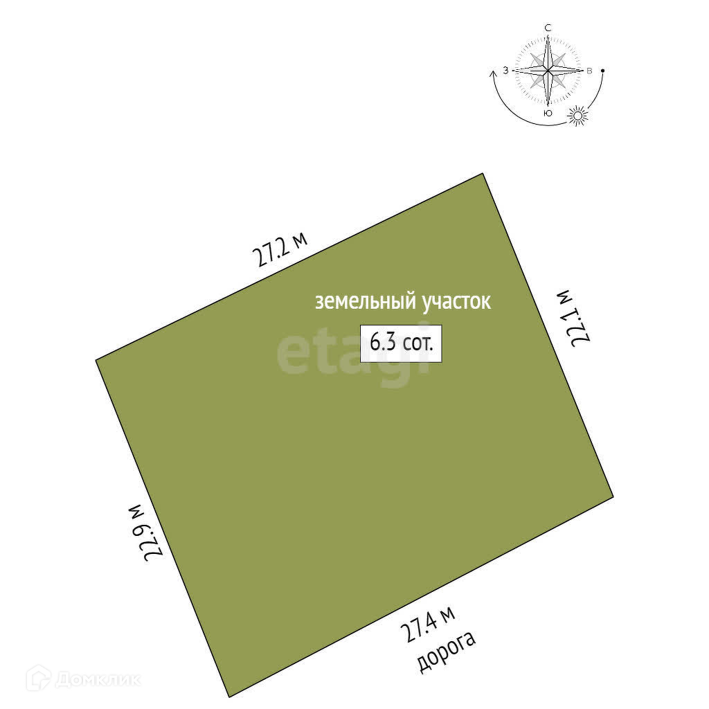 Площадь участка составляет 6,3 сотки,ИЖС, расположен на первой линии возле дороги. Участок ровный, правильной формы, проведено межевание.