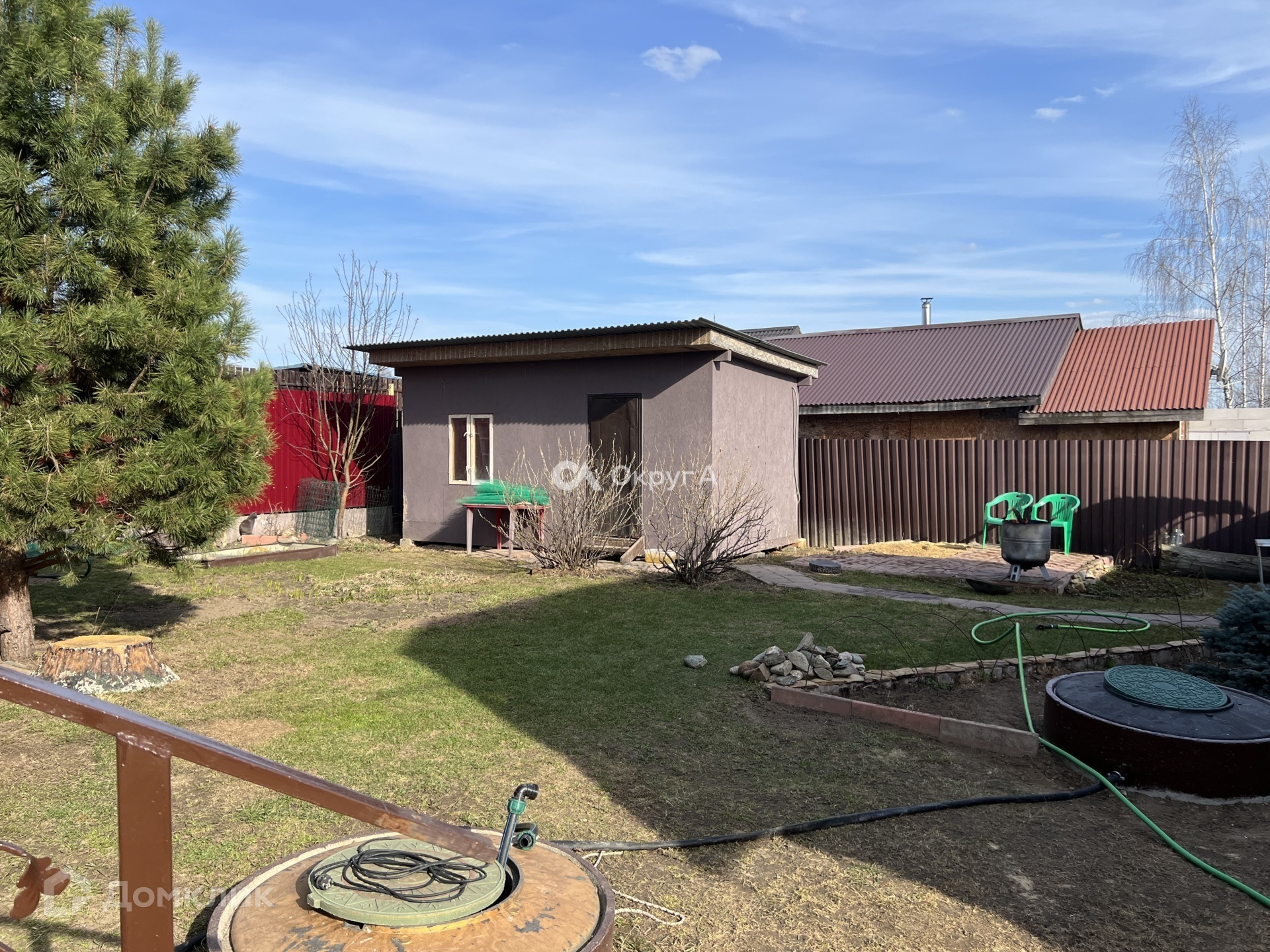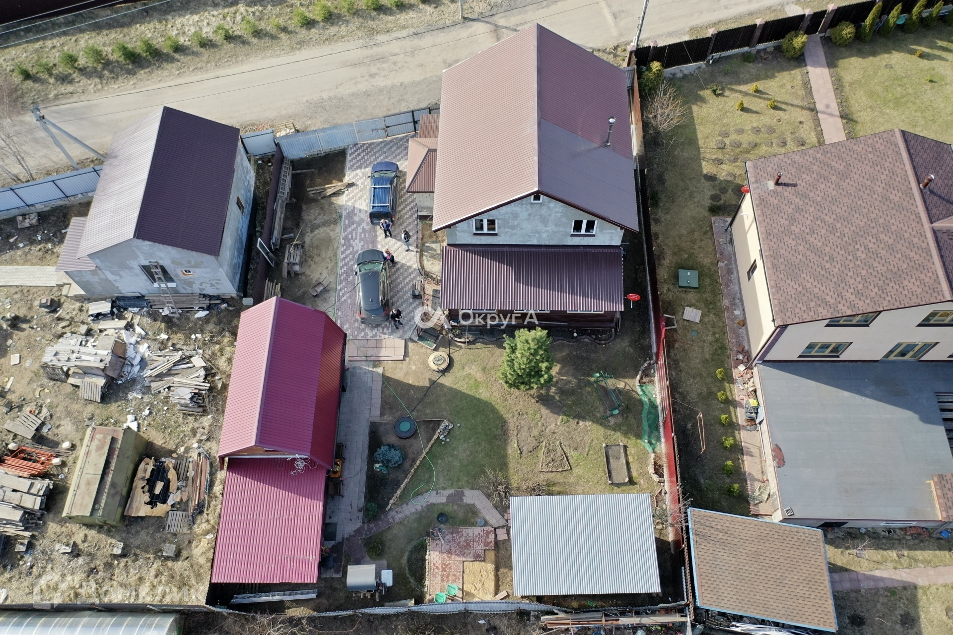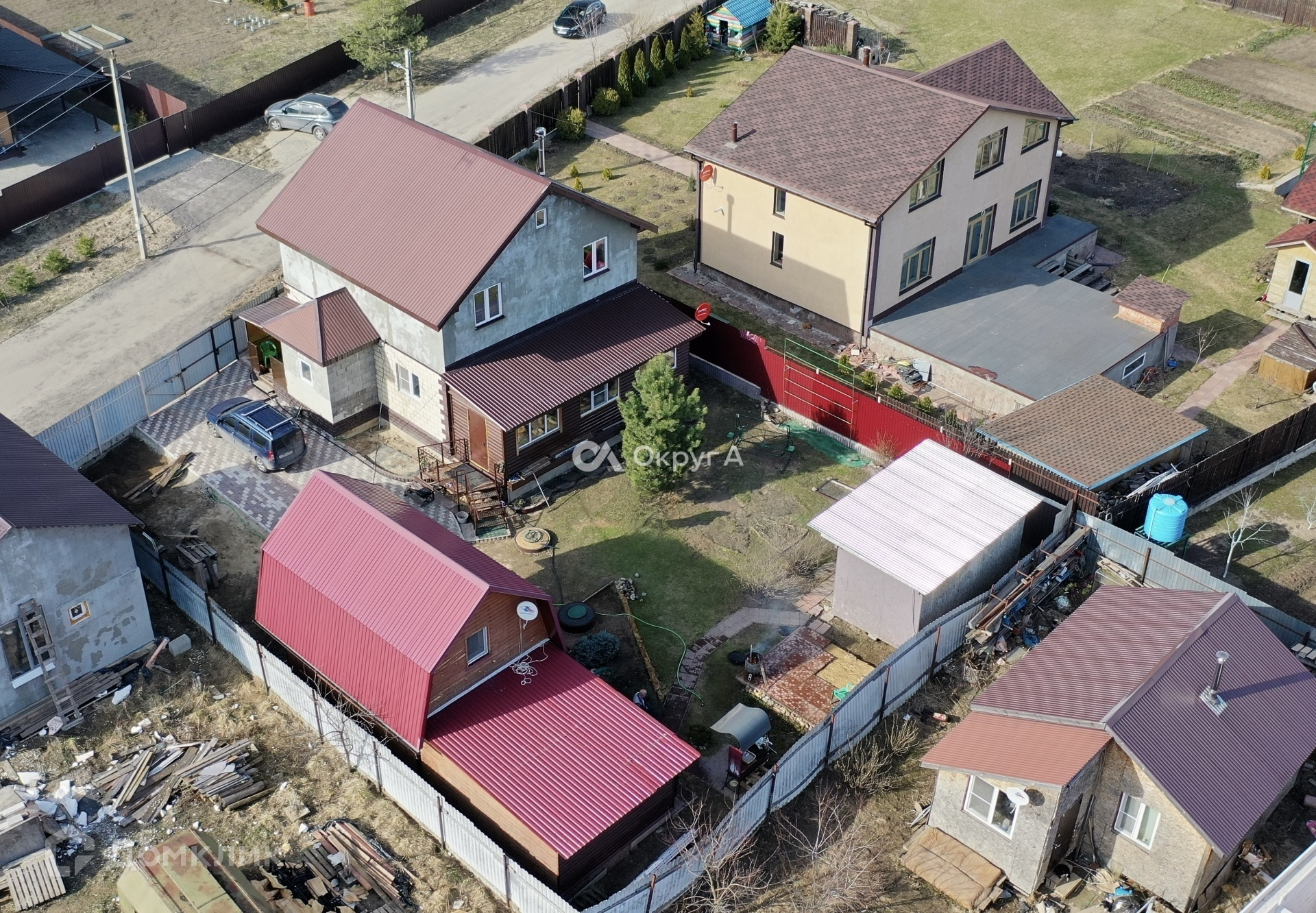 Участок 6 соток, правильной прямоугольной формы с элементами ландшафтного дизайна. По периметру установлен капитальный забор на собственном фундаменте, оборудовано парковочное место для нескольких автомобилей. Придомовая территория выложена брусчаткой. Участок засеян газонной травой, имеются плодовые насаждения.