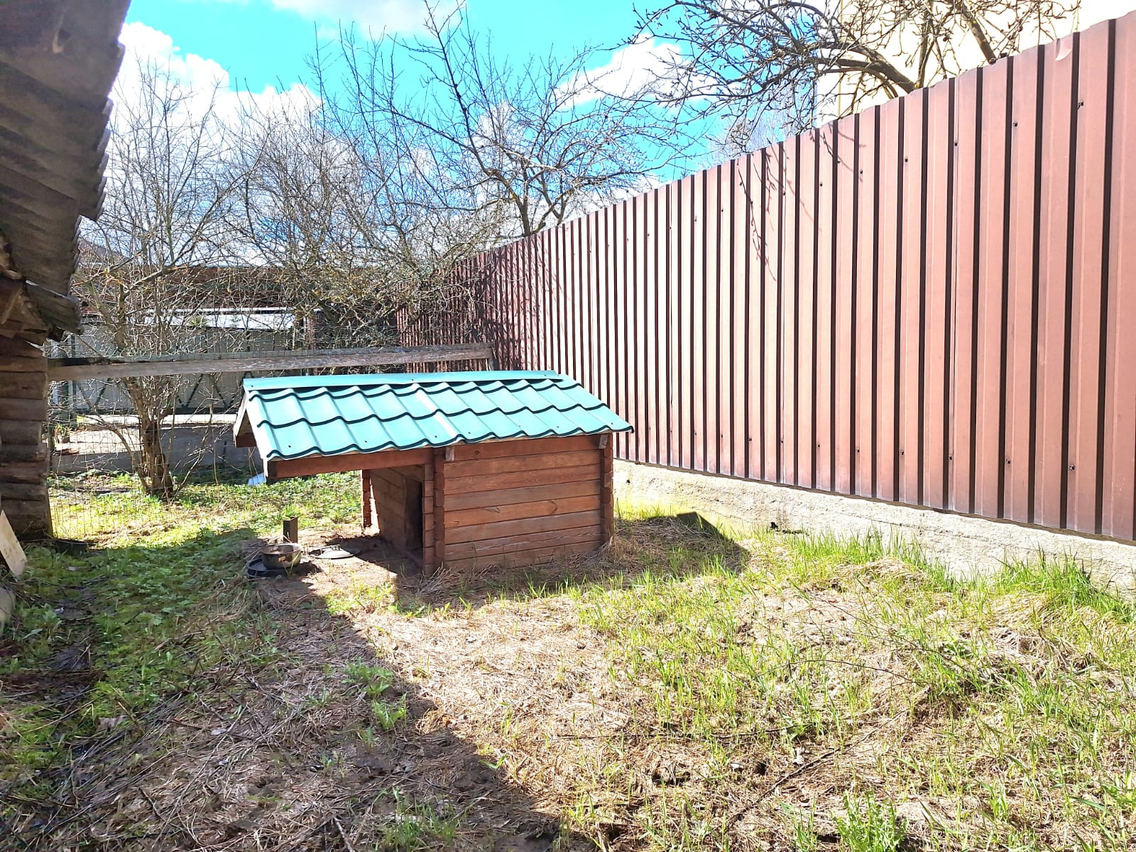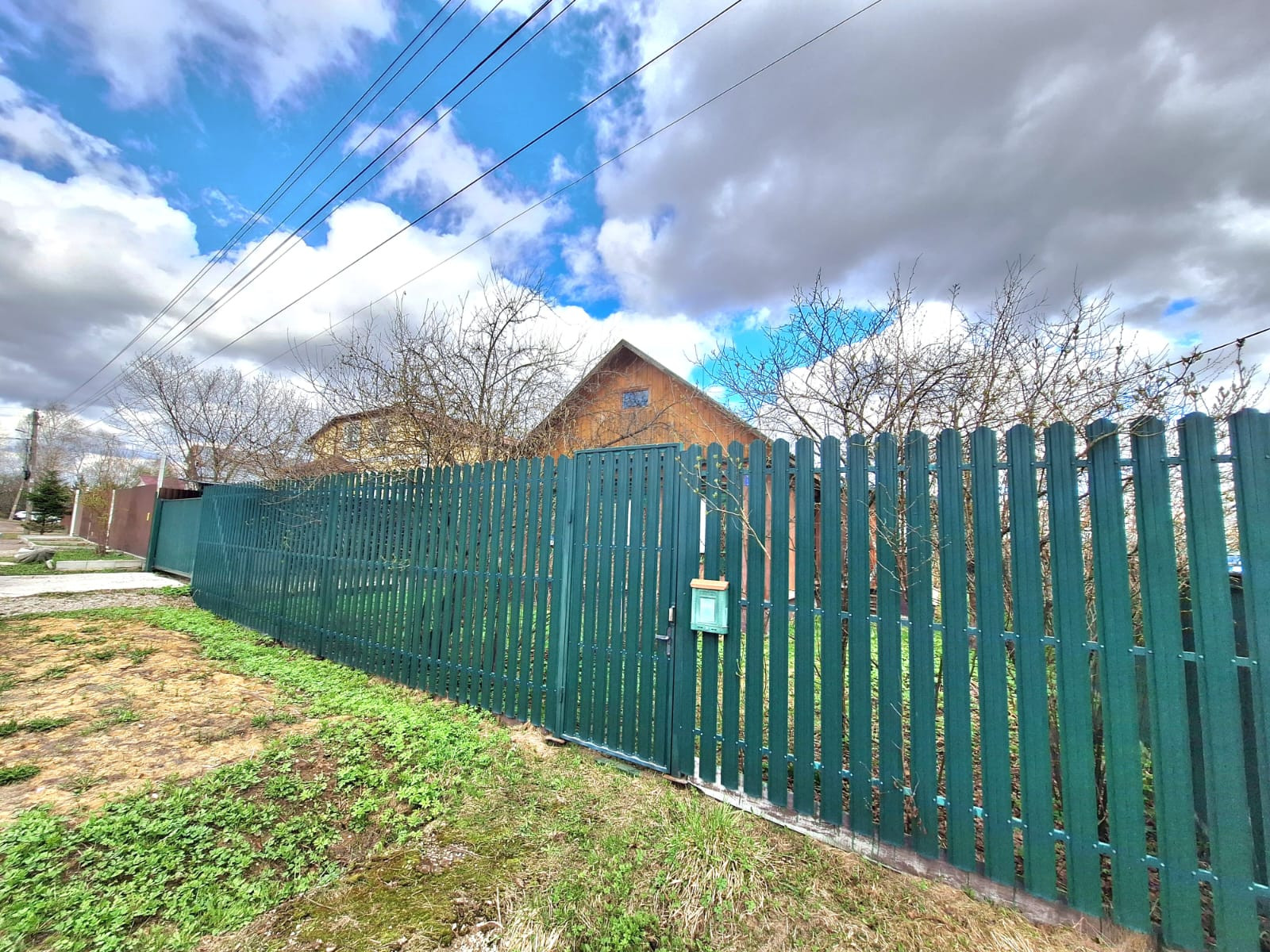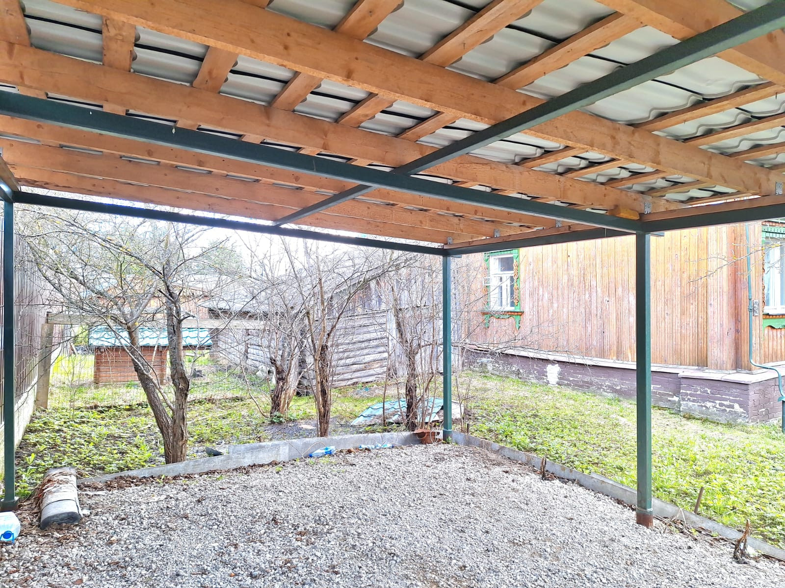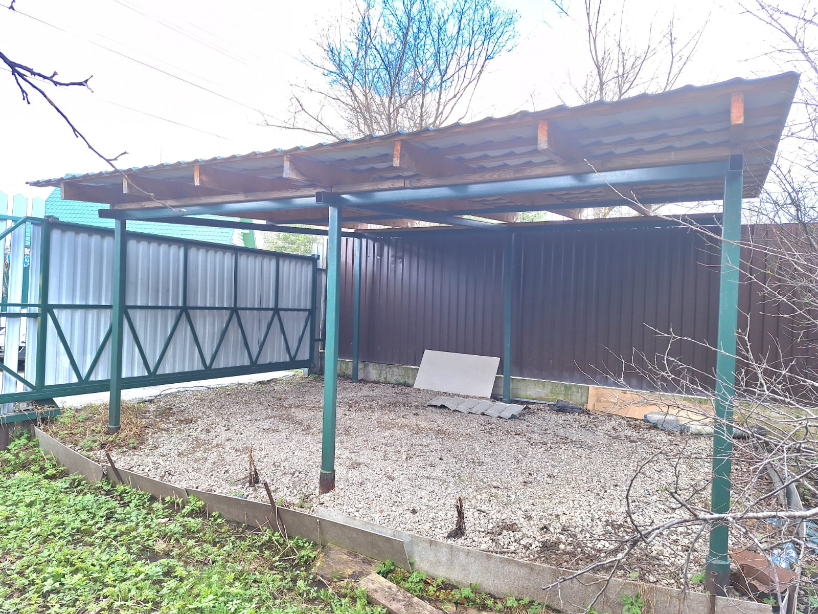 Отсыпана площадка под парковку, сделан навес и откатные ворота со стороны фасадного забора.