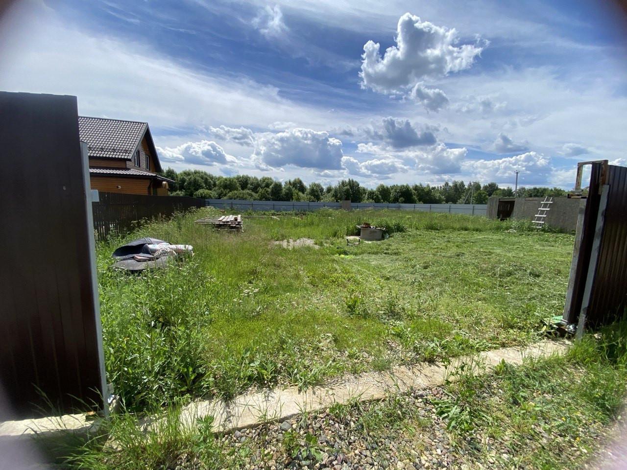 Откатные ворота с мотором. Также внутри участка по периметру забора выполнен дренаж ( смотровые колодцы каждые 15м).