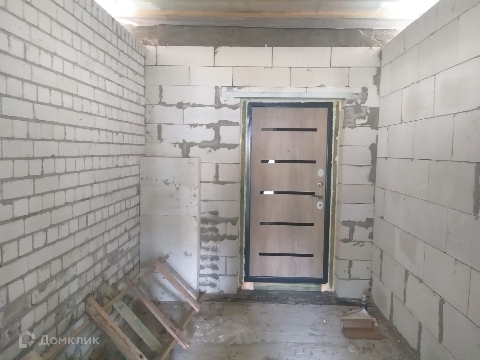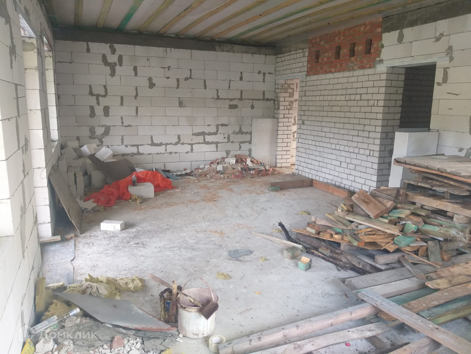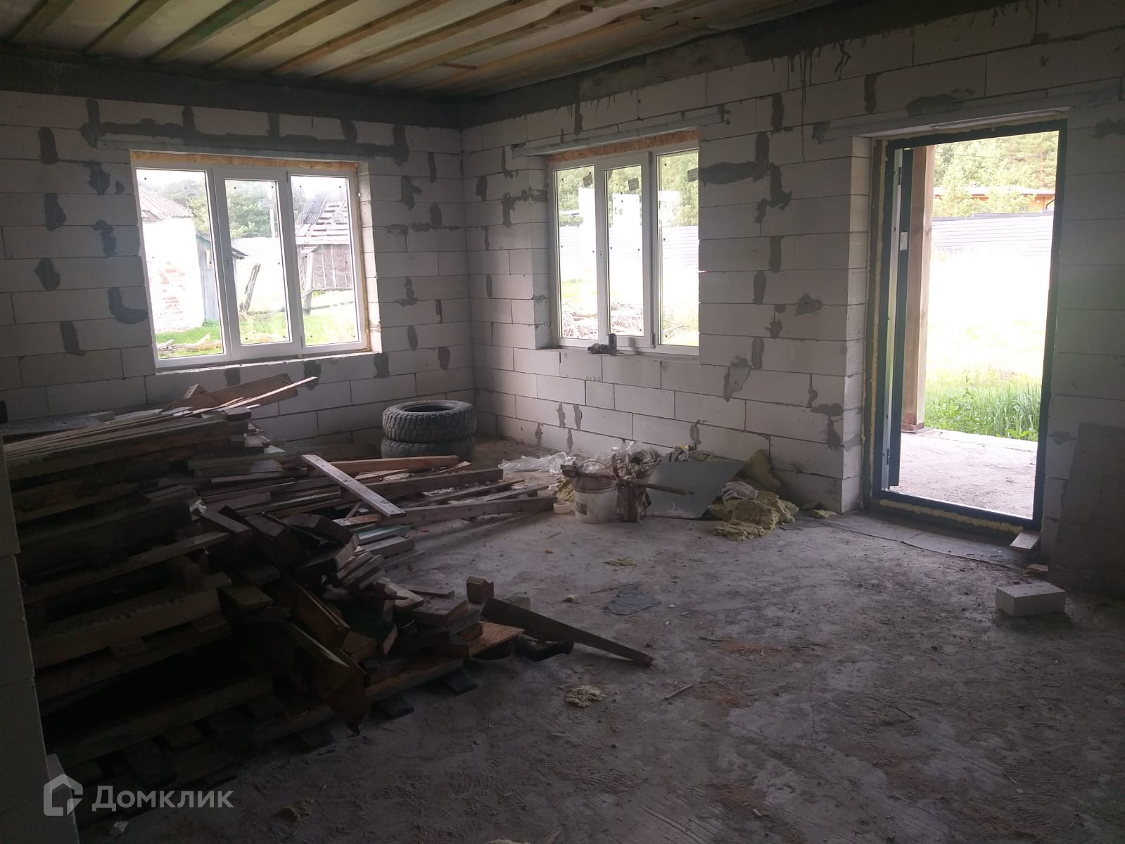 Дом построен из газосиликатных блоков с двускатной крышей из металлочерепицы. Установлены пластиковые окна и металлические двери. Полы забетонированы.