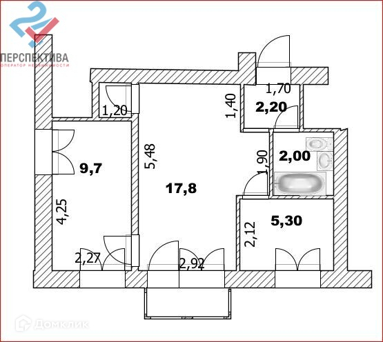 Общая площадь 39.7 м2
