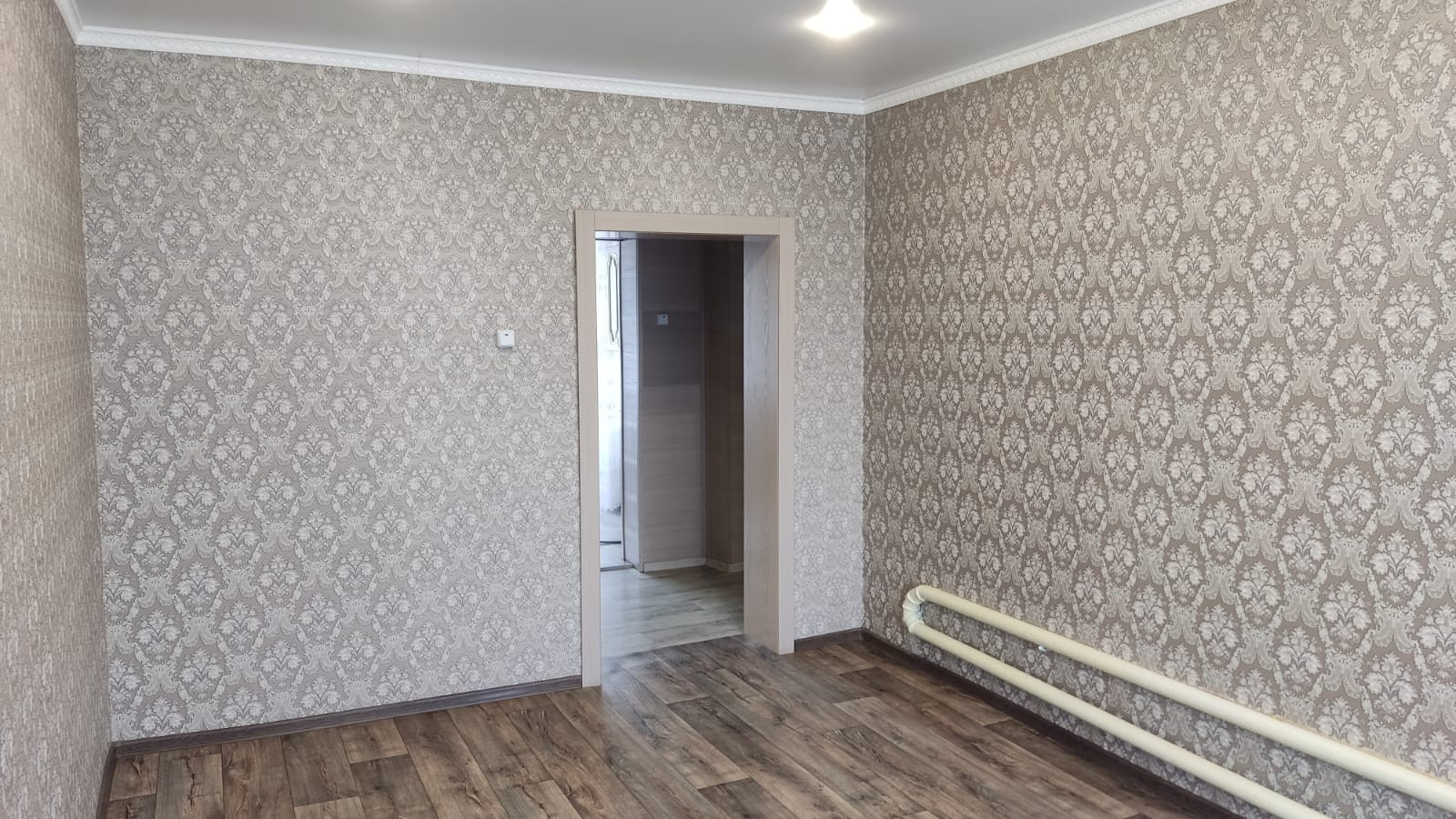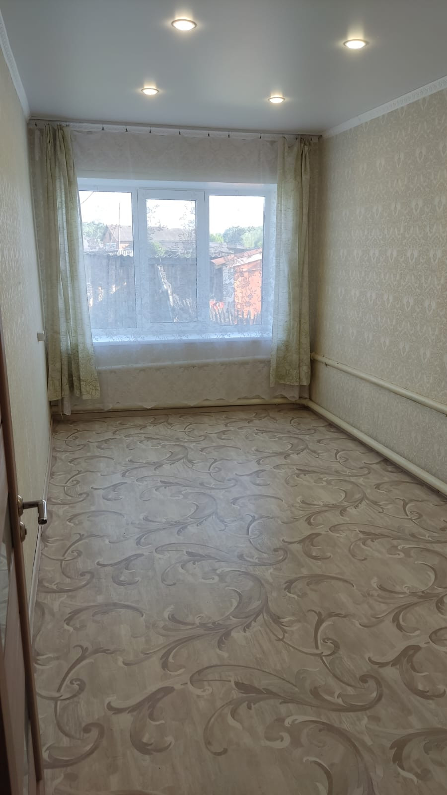 В зале и спальне стены выровнены гипсокартоном, поклеяны хорошие обои; в коридоре, на кухне и душевой панели (МДФ и ПВХ), в трёх комнатах натяжные потолки, хорошее освещение. До одной спальни руки не дошли сделать ремонт.