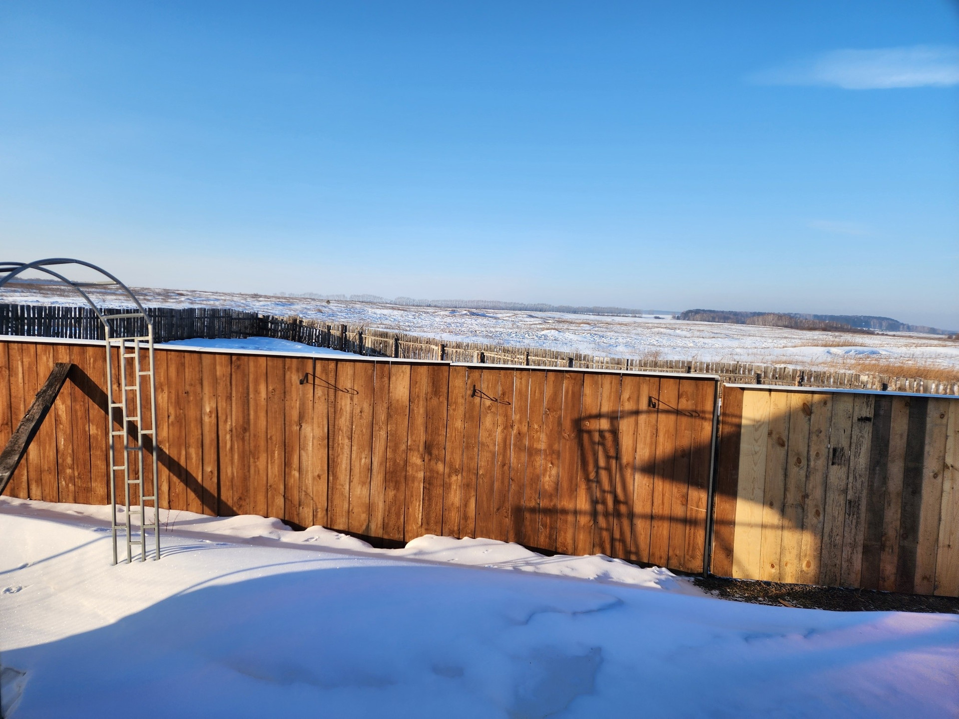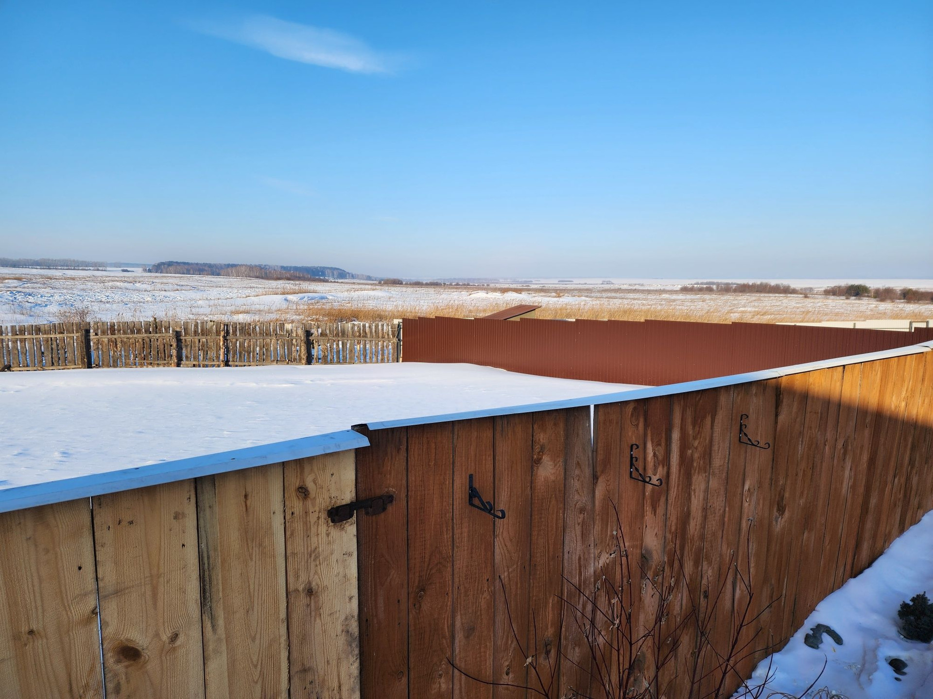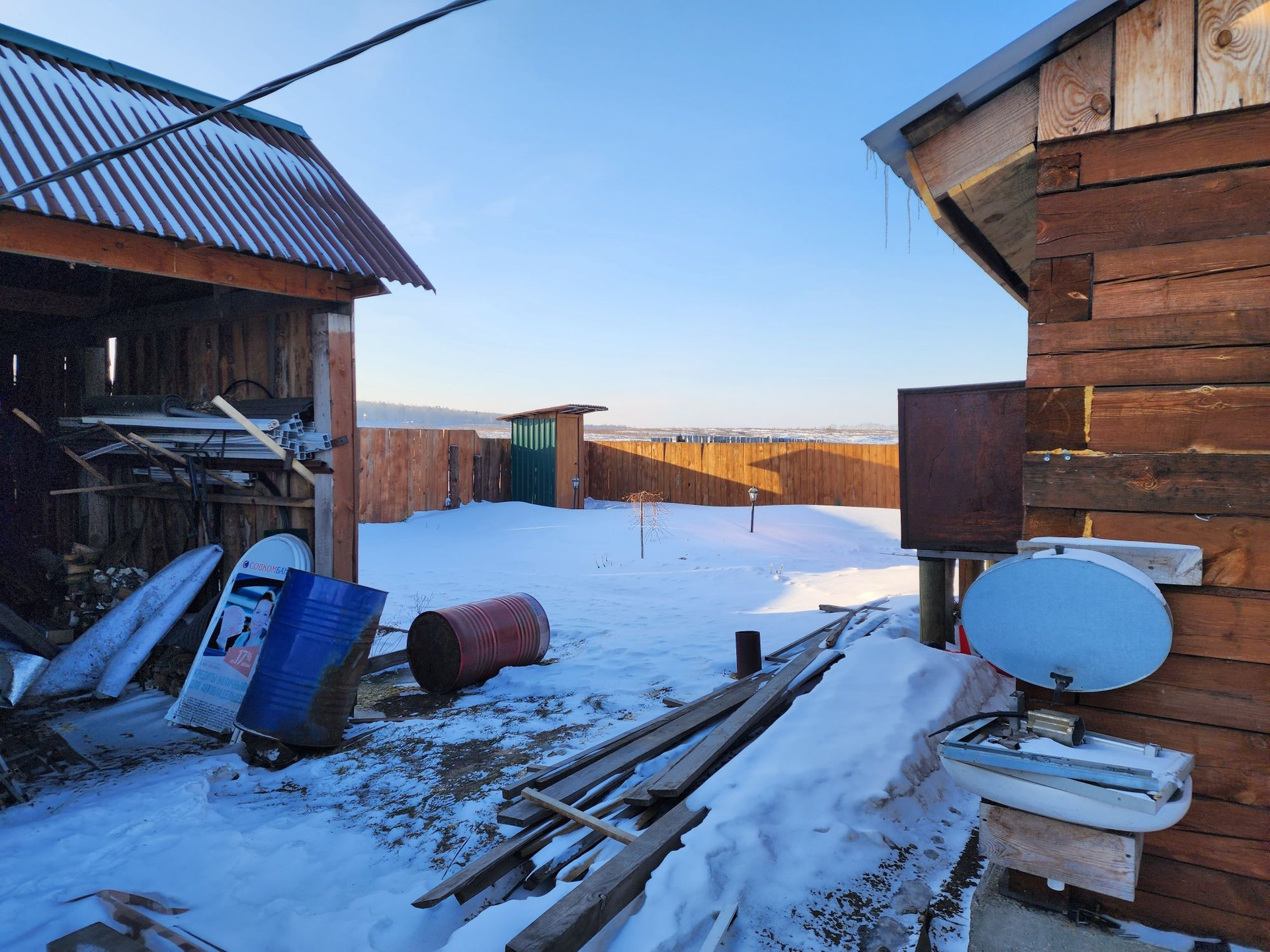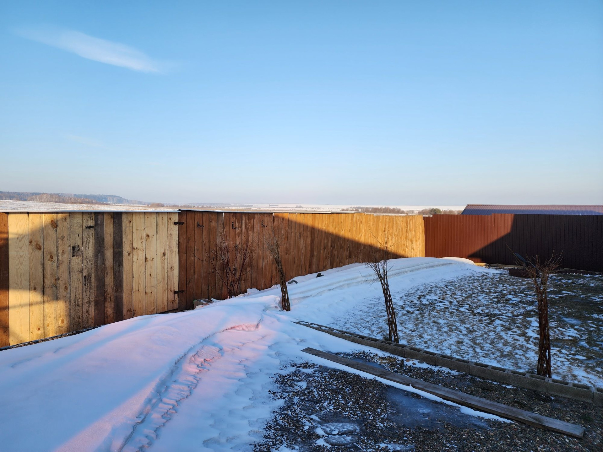 Огород от основного участка отделен высоким деревянным забором.