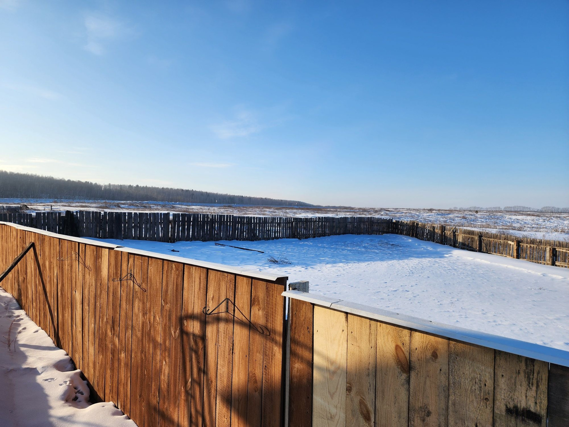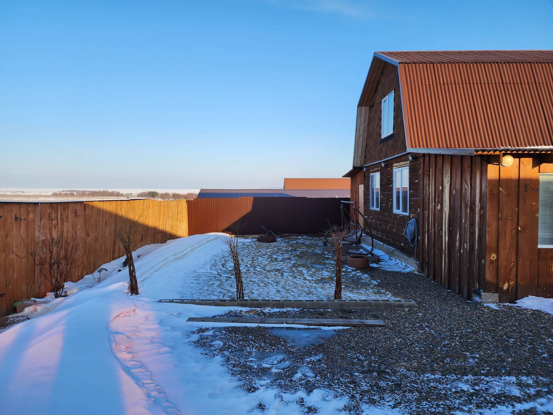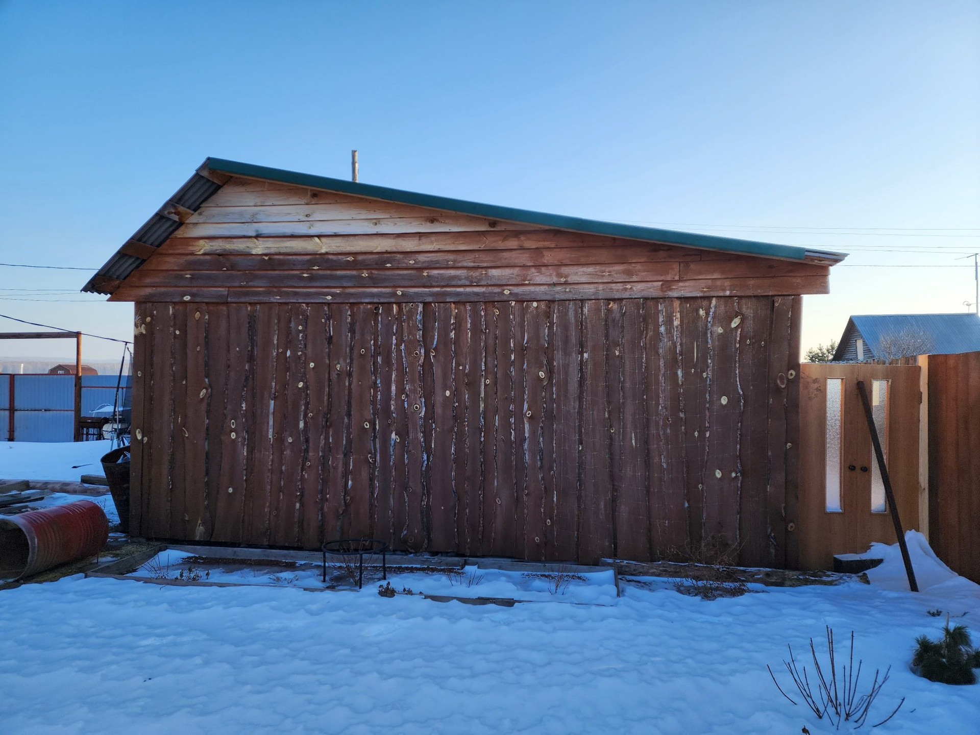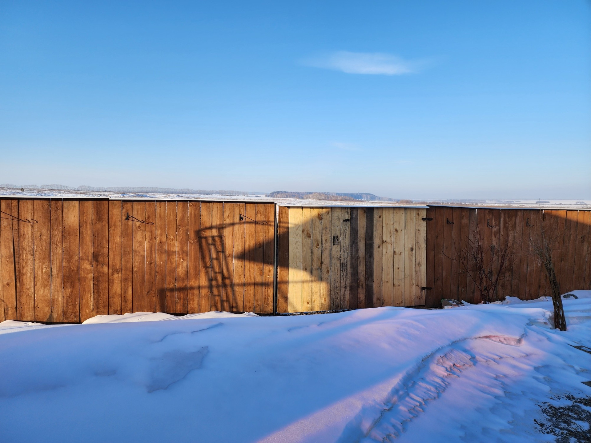 Огород от основного участка отделен высоким деревянным забором.