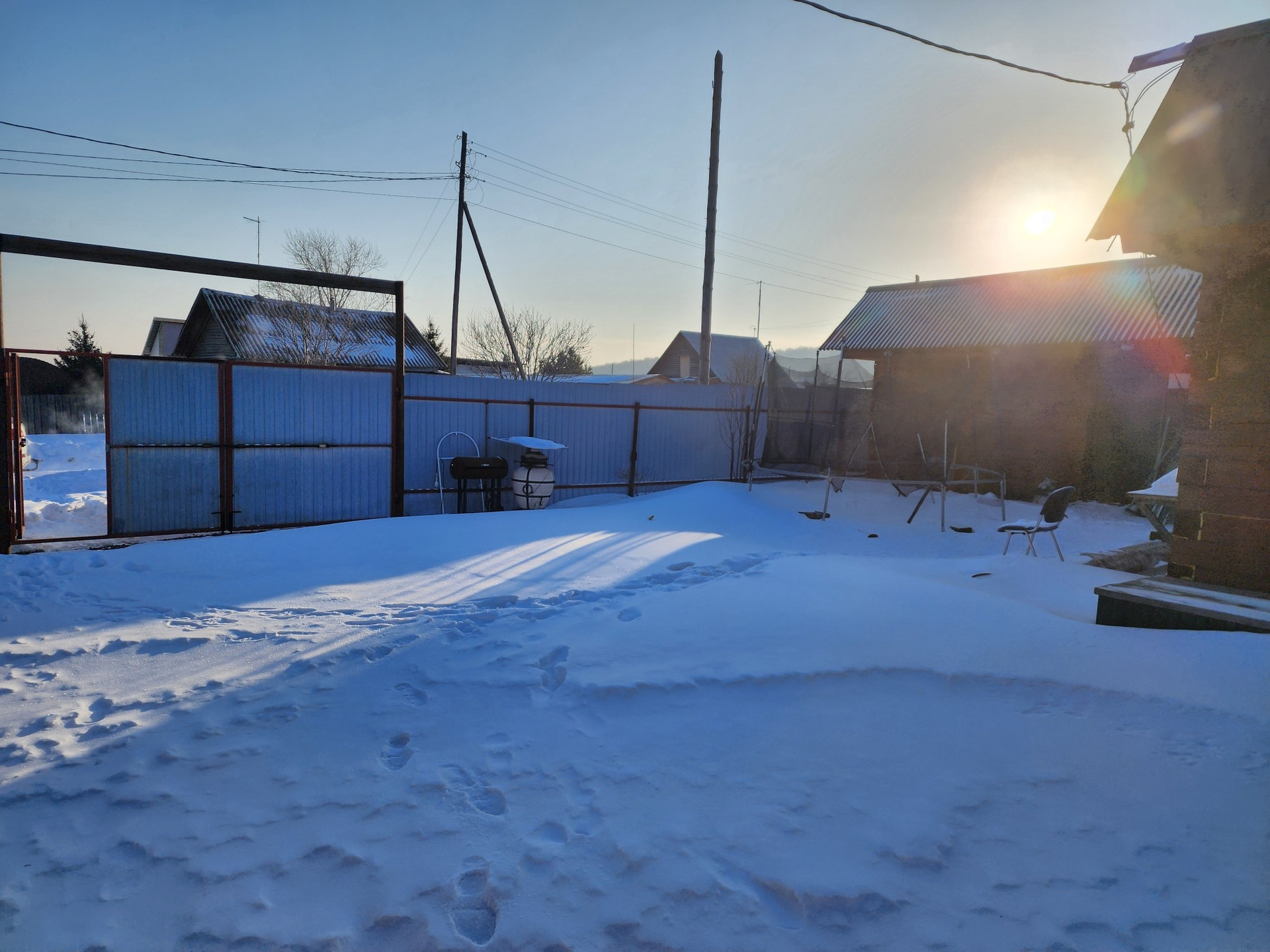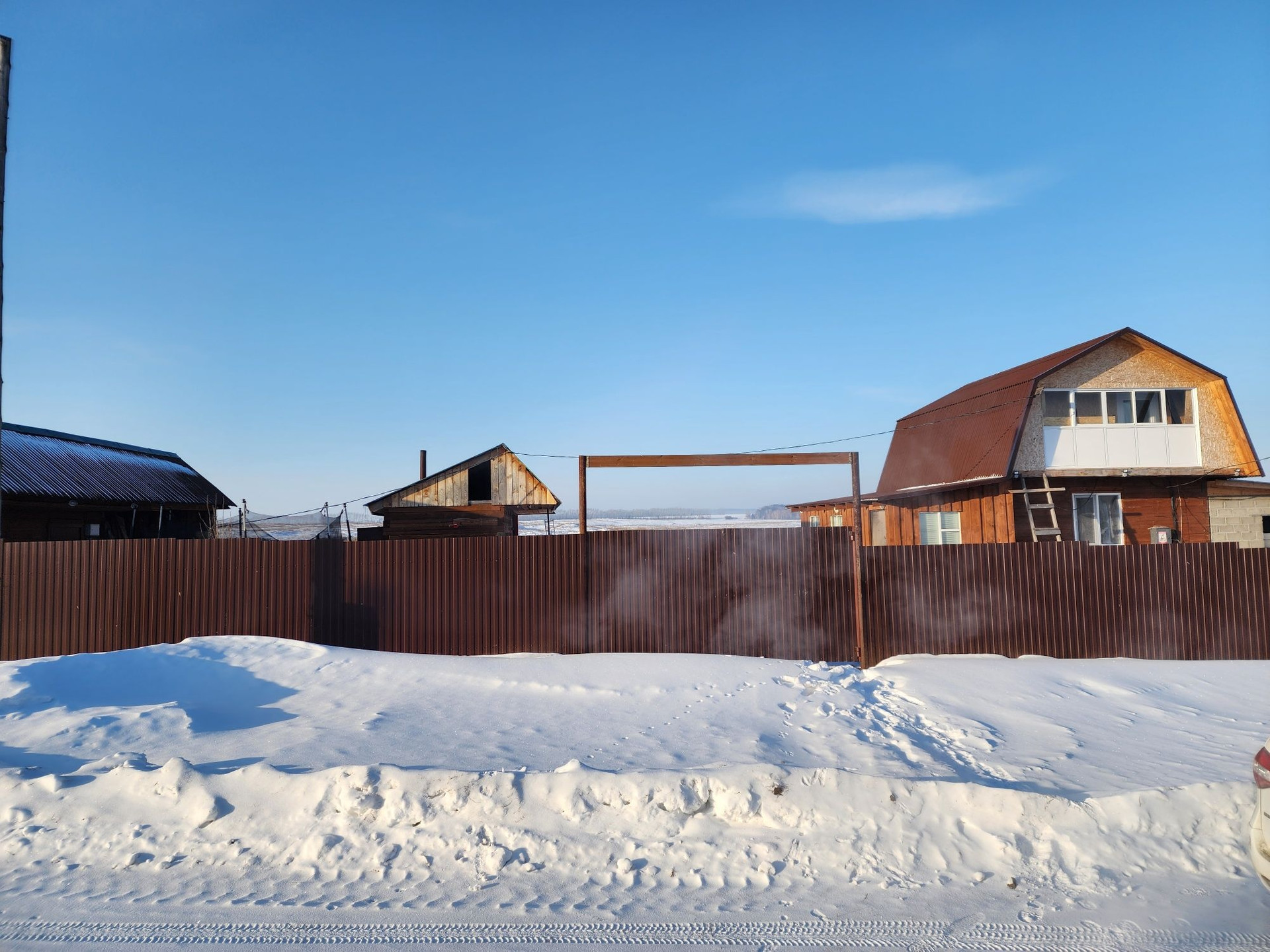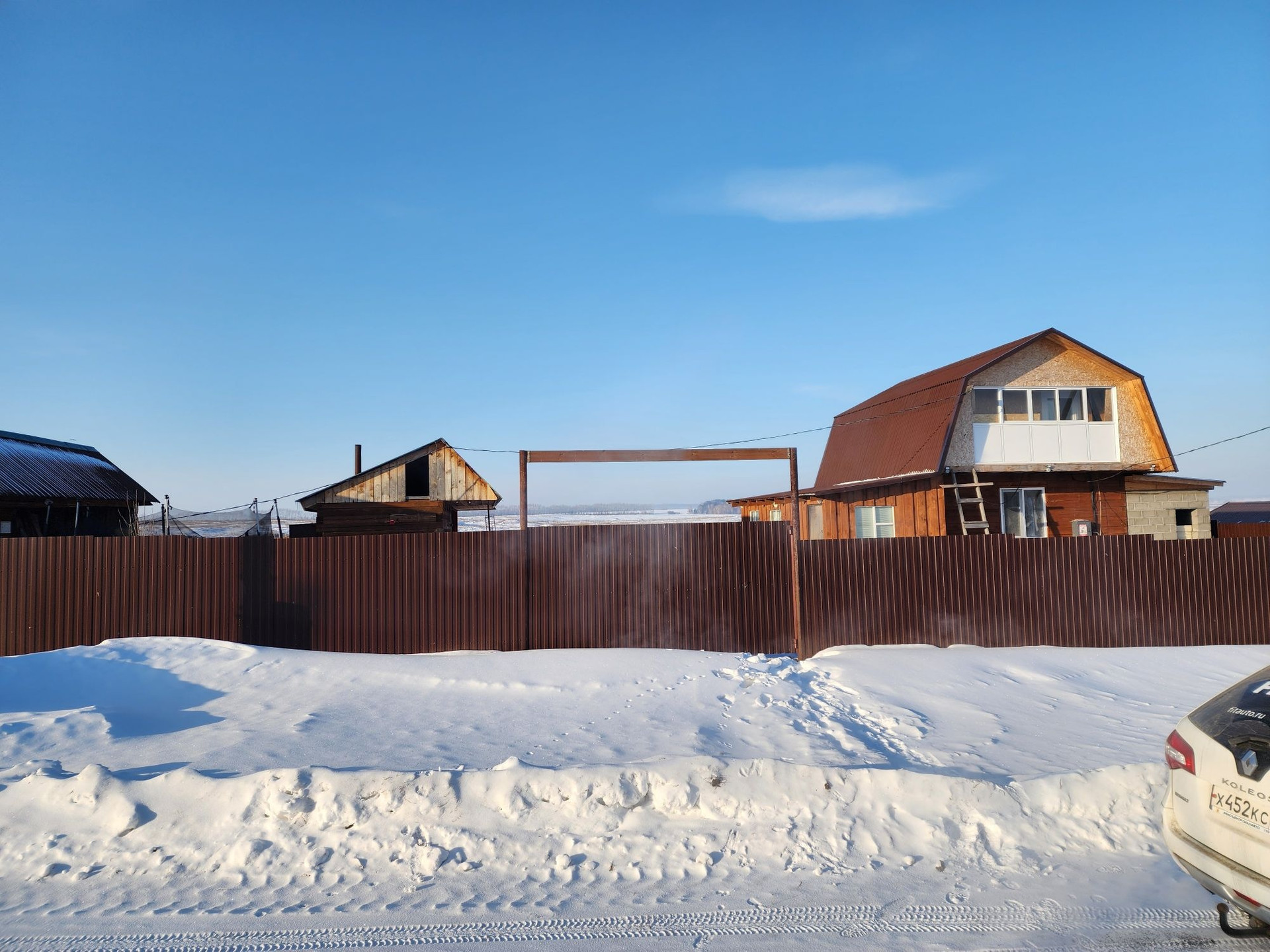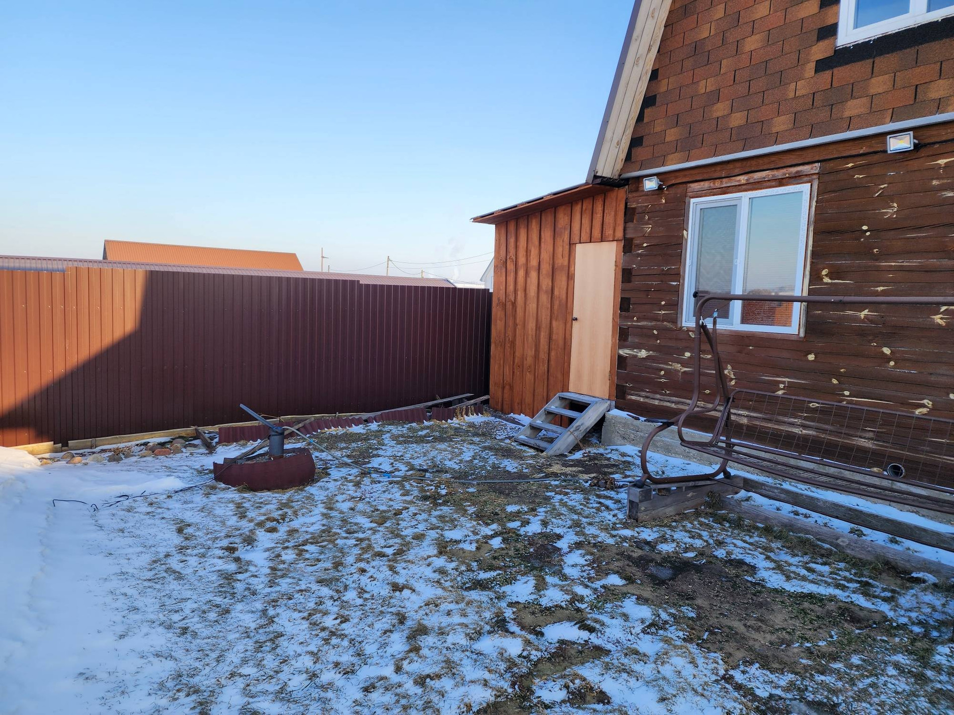 Огород от основного участка отделен высоким деревянным забором.