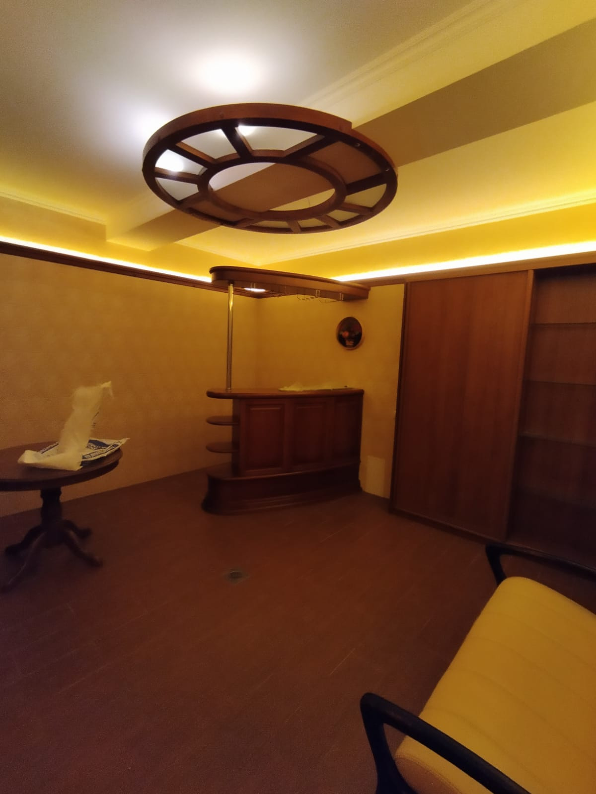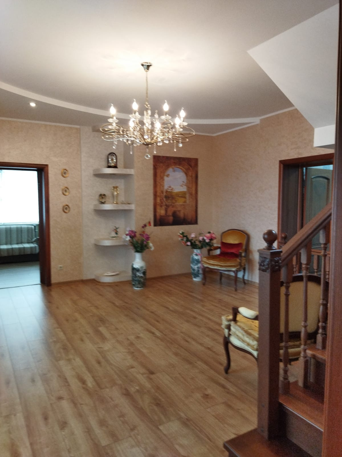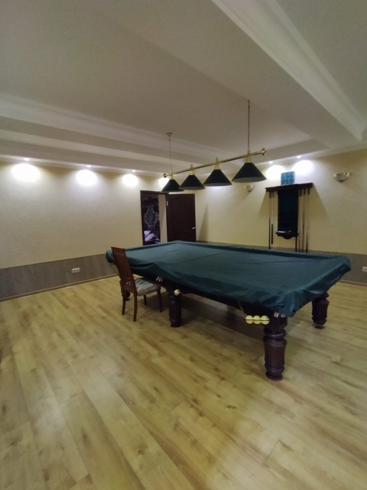 С веранды спускаемся в цокольный этаж, где расположена бильярдная, сауна с двумя комнатами отдыха, винный бар с барной стойкой , винные шкафы, санузел. В цоколе также расположены котельная , водопроводная, электрощитовая, гараж с подъёмными воротами. В котельне стоят электро котёл и дровяной котёл, система нагрева тёплых полов и радиаторов, всё работает на электронике. В водопроводной расположена вся система очистки воды , система фильтрации бассейна.