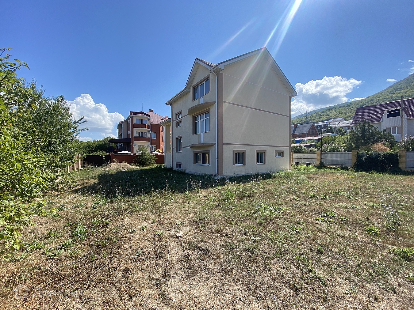 Объект №119831 Продается двухэтажный дом в курортном поселке Сукко. Площадь дома - 246 м² , площадь участка 9 сот, фасад - 32 м.  . дом находится в предчистовой отделке. На первом этаже — кухня столовая и спальня, а также большая веранда, на втором и цокольном этажах — по три комнаты для проживания, комнаты чистые, уютные, комфортные, высокие потолки. Два входа: на первый и цокольный этаж.