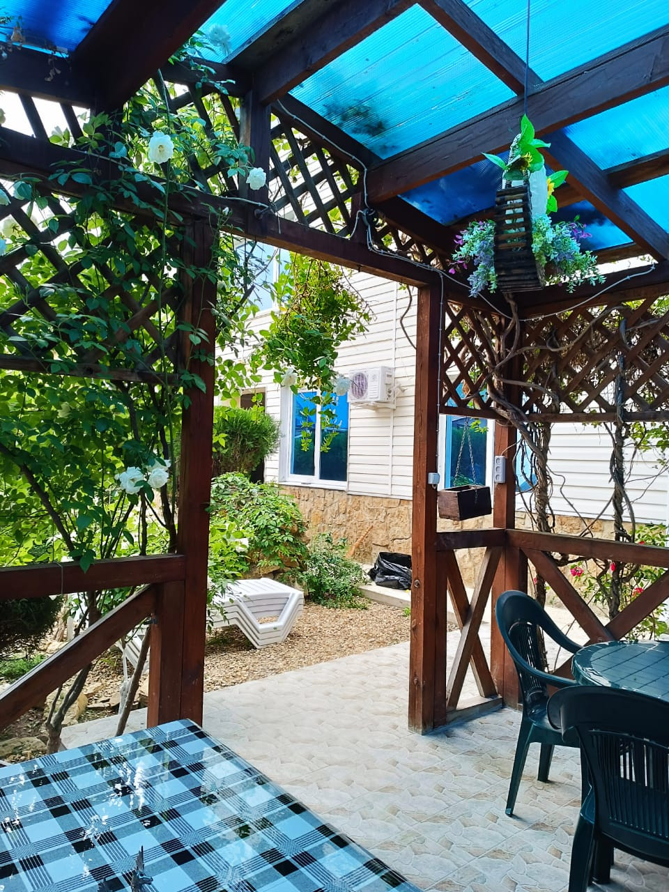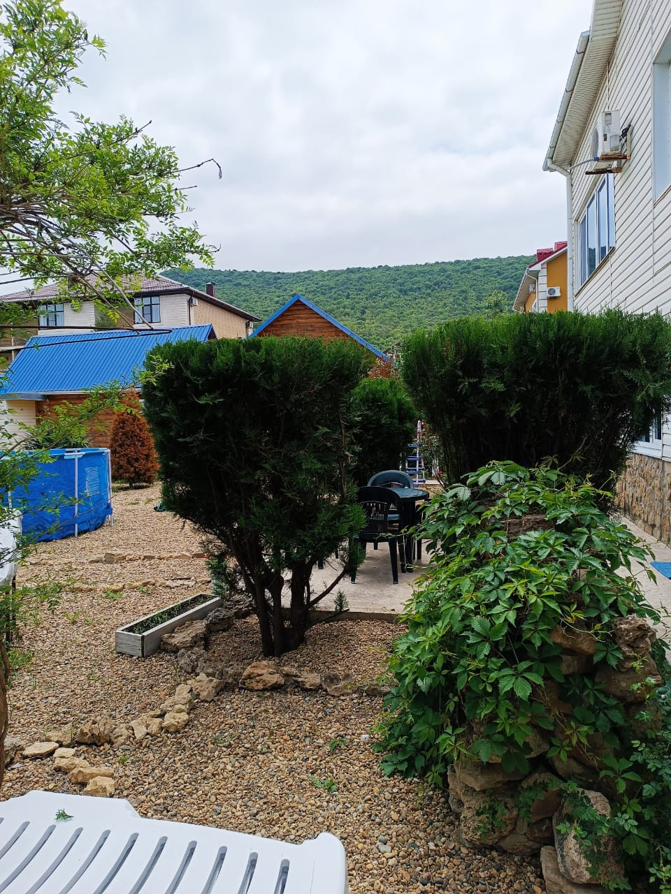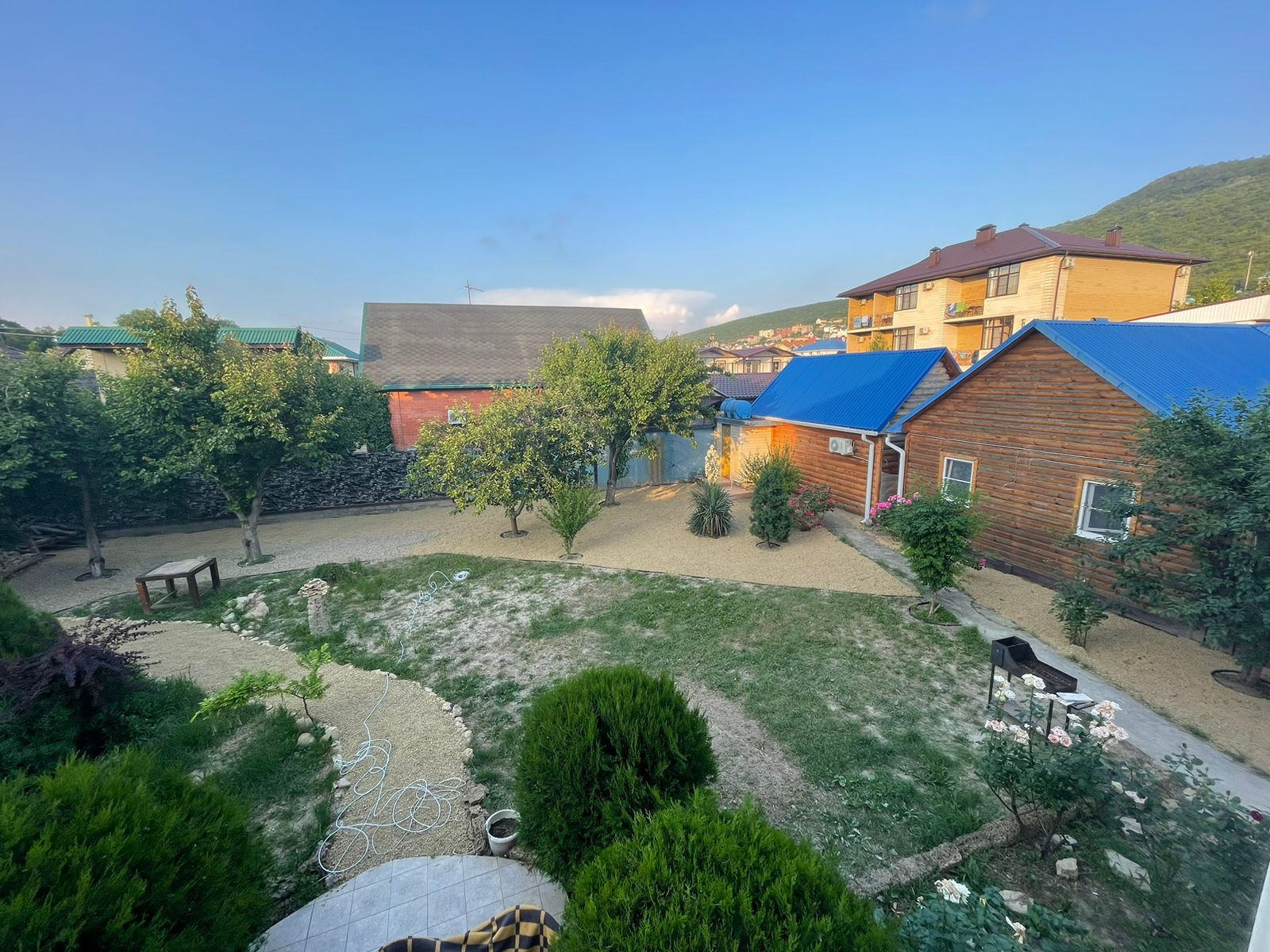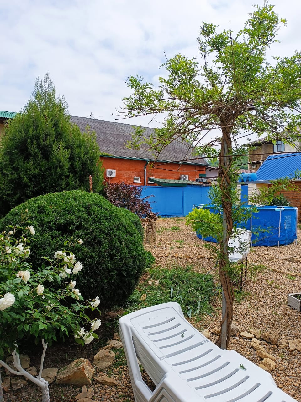 В просторном дворе есть зоны отдыха, беседка есть мангал, Во дворе выложено морской галькой (создается впечатление, что находишься на море) фруктовый сад и декоративные растения. Все максимально приближено к природе.