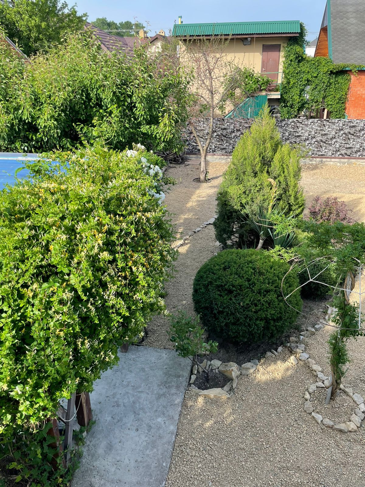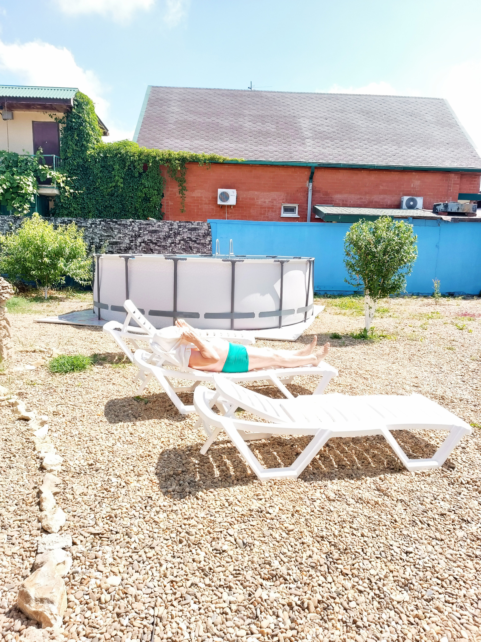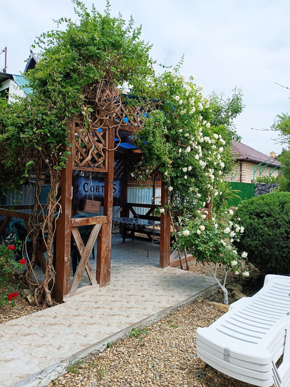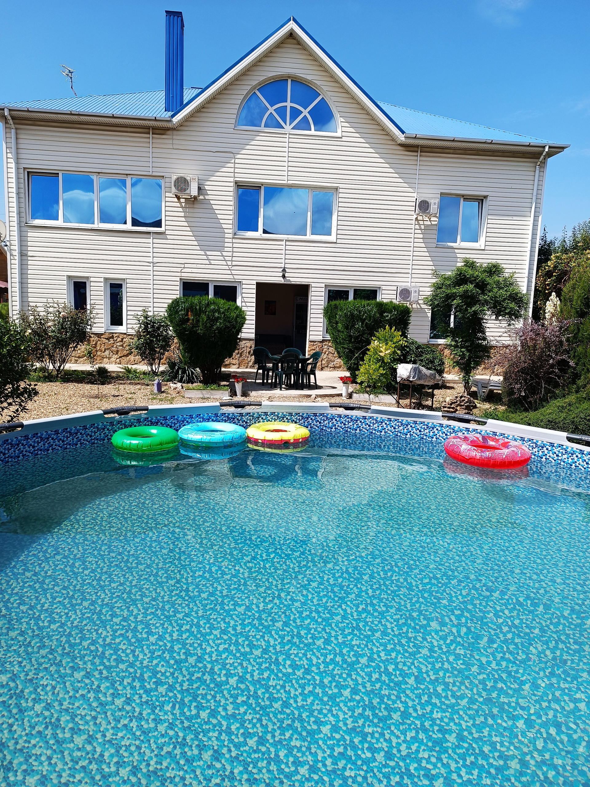 В просторном дворе есть зоны отдыха, беседка есть мангал, Во дворе выложено морской галькой (создается впечатление, что находишься на море) фруктовый сад и декоративные растения. Все максимально приближено к природе.