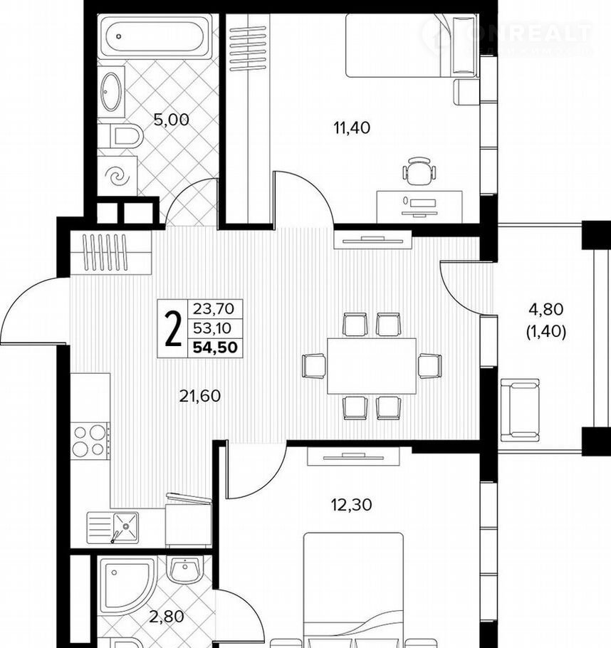 Общая площадь 54.5 м2
