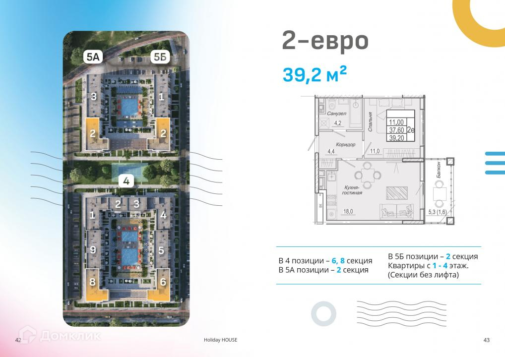 Общая площадь - 39,2 м2. Просторная кухня-гостиная - 18 м2.
