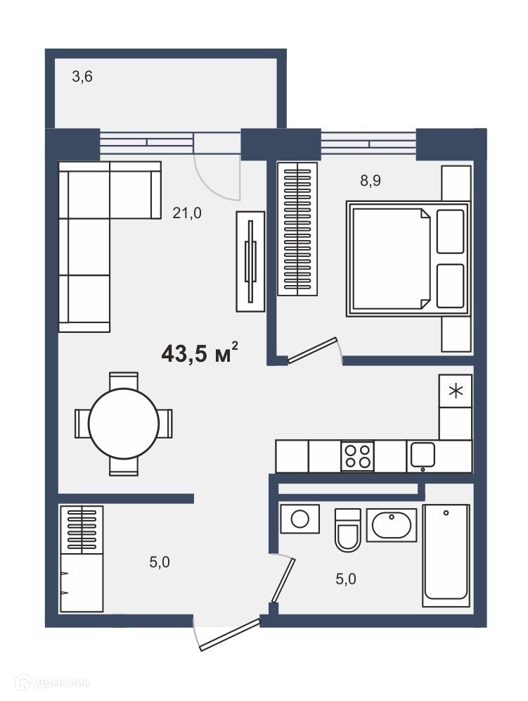 Общая площадь 43.5 м2