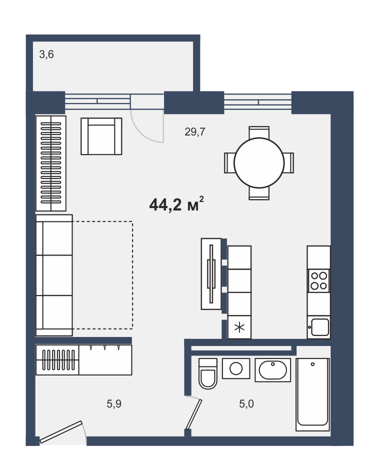 Общая площадь 44.2 м2