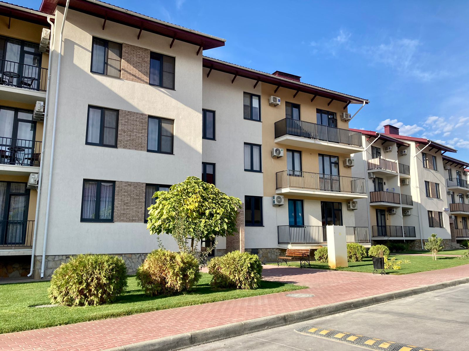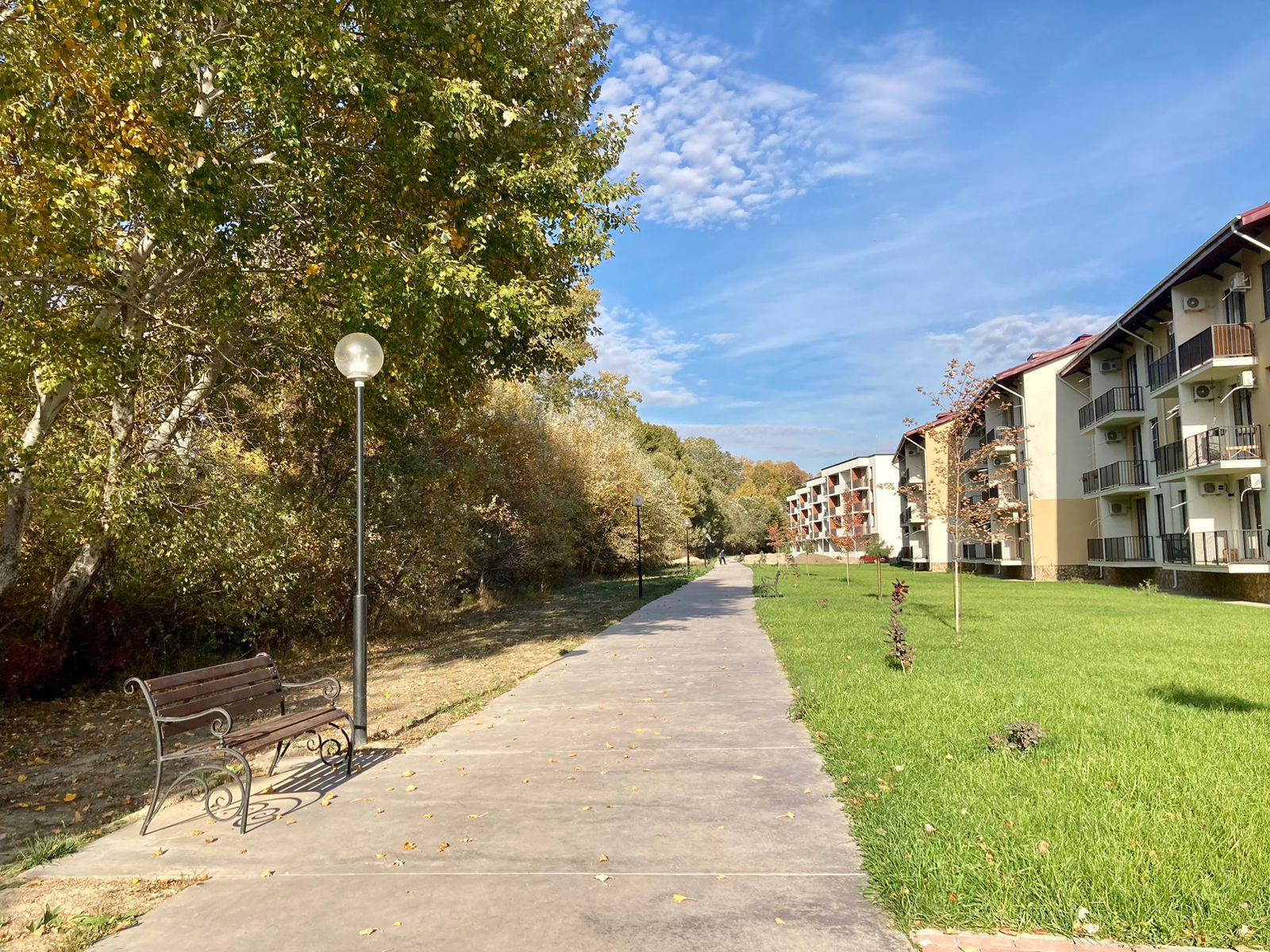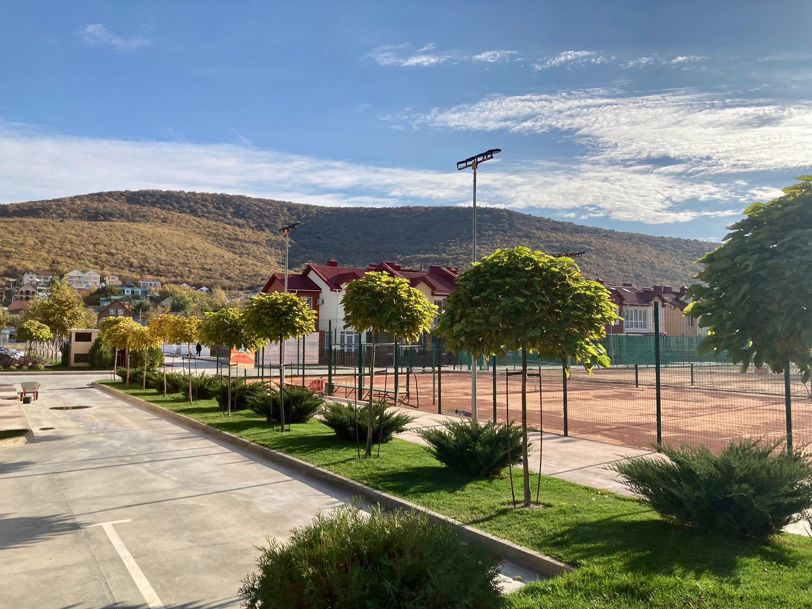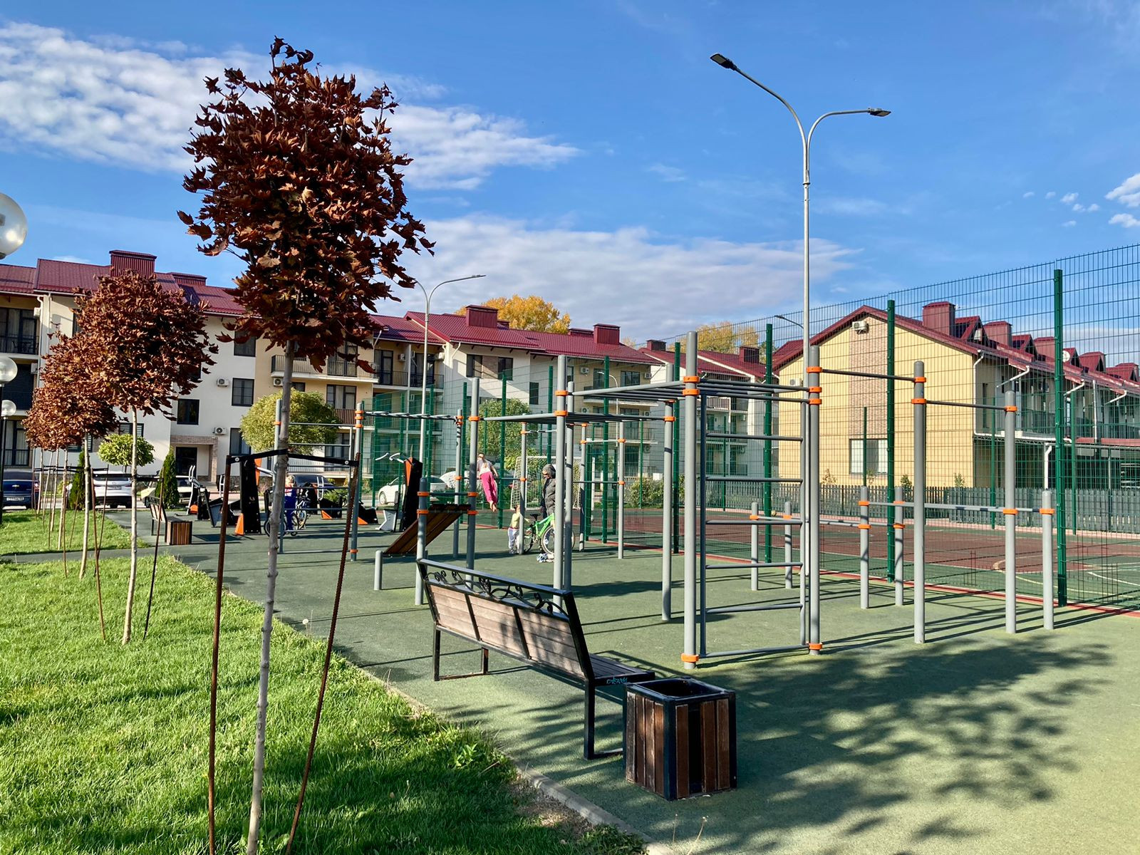 На территории жилого комплекса имеются: прогулочная зона с велодорожками, бассейн, теннисные корты, детские и спортивные площадки, кафе, зона барбекю. Закрытая охраняемая территория с видеонаблюдением.